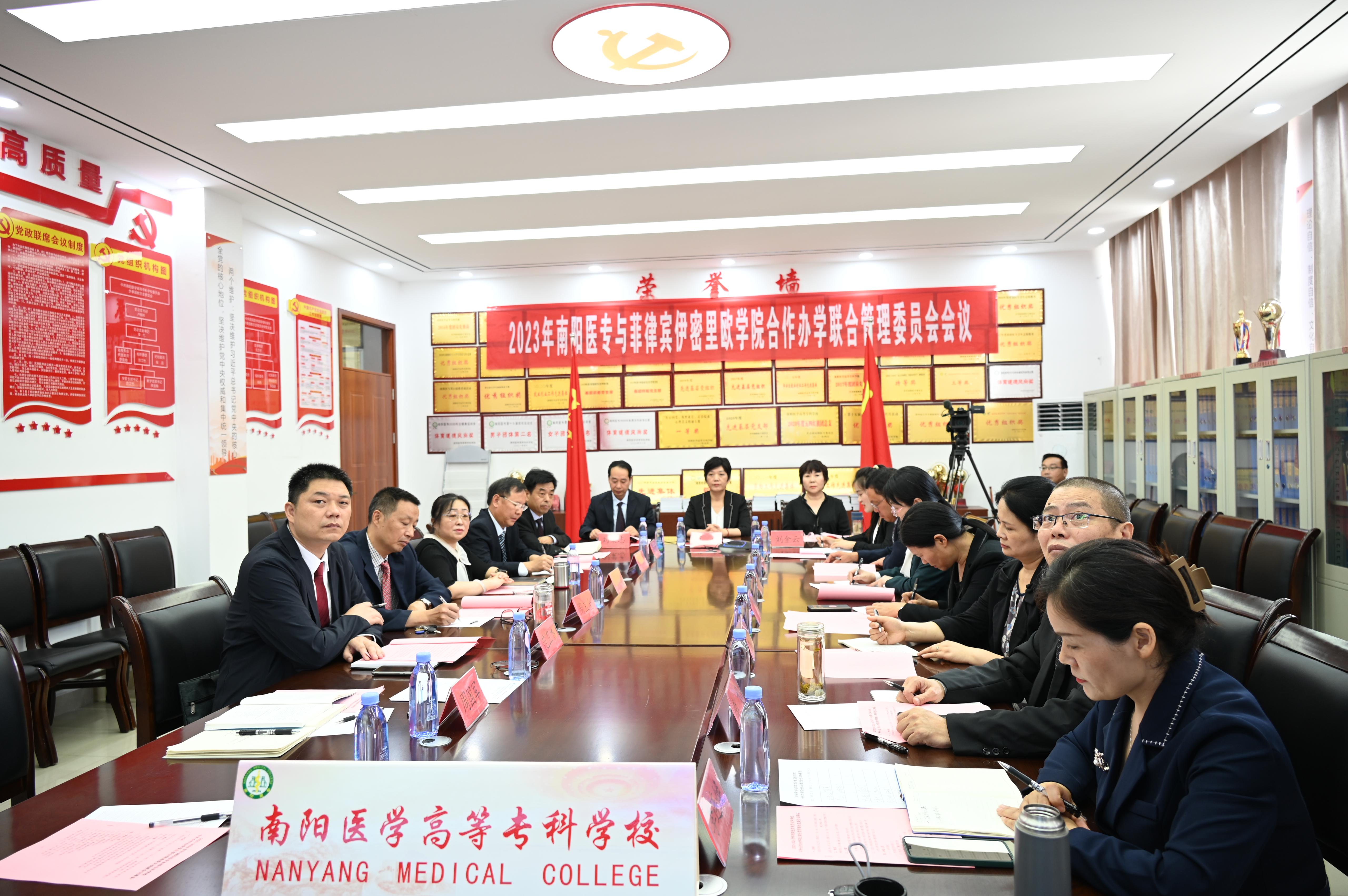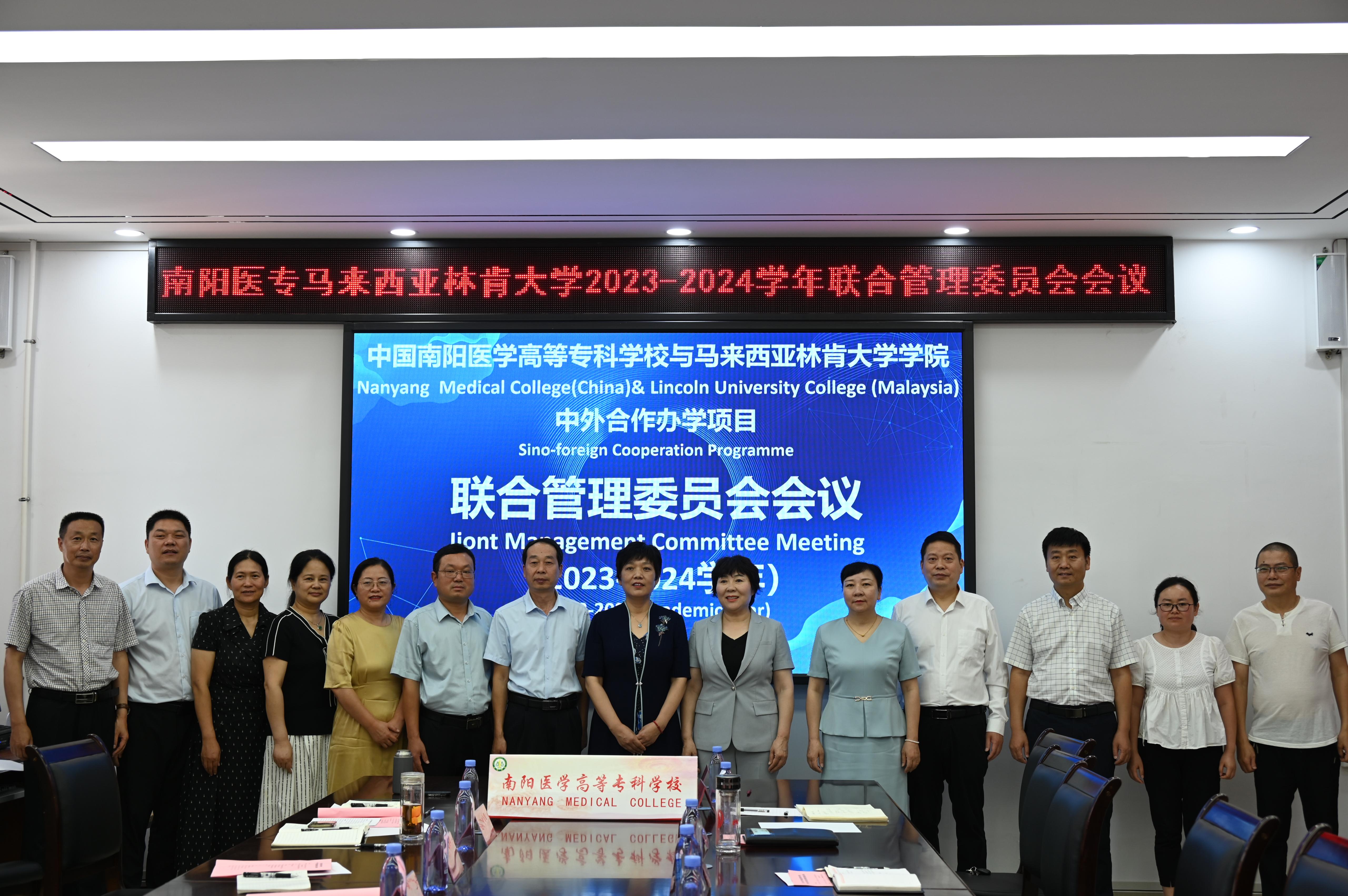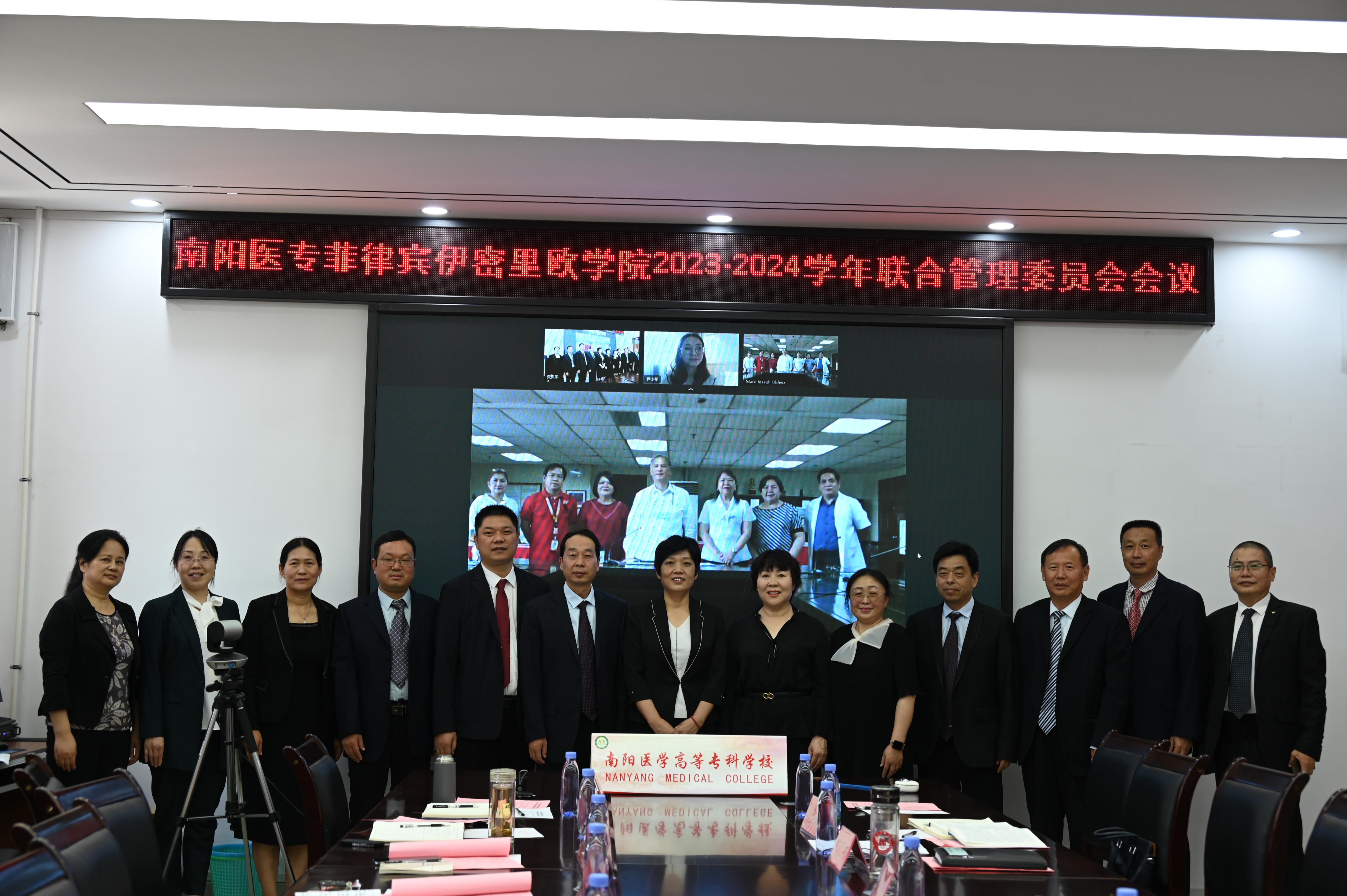 本网讯(文/外事处 夏灵果) 8月22日、23日,我校在仲景西区3号教学楼423会议室召开2023—2024学年中外合作办学联合管理委员会视频会议,校领导范真、刘荣志出席,马来西亚林肯大学学院校长拿督比和口腔医学院院长、美国哈森大学副校长琳恩及2个涉教部门主任,菲律宾伊密里欧学院校长康伯斯及3个涉学系部主任通过“钉钉”线上参会,我校党委宣传部、教务处、学生处、计财处、质管办、就业创业处、外事处、临床医学系、康复医学系、口腔医学系、药学系、医学技术系、护理系、国际教育学院负责人线下参会。校纪委书记刘金云主持会议。