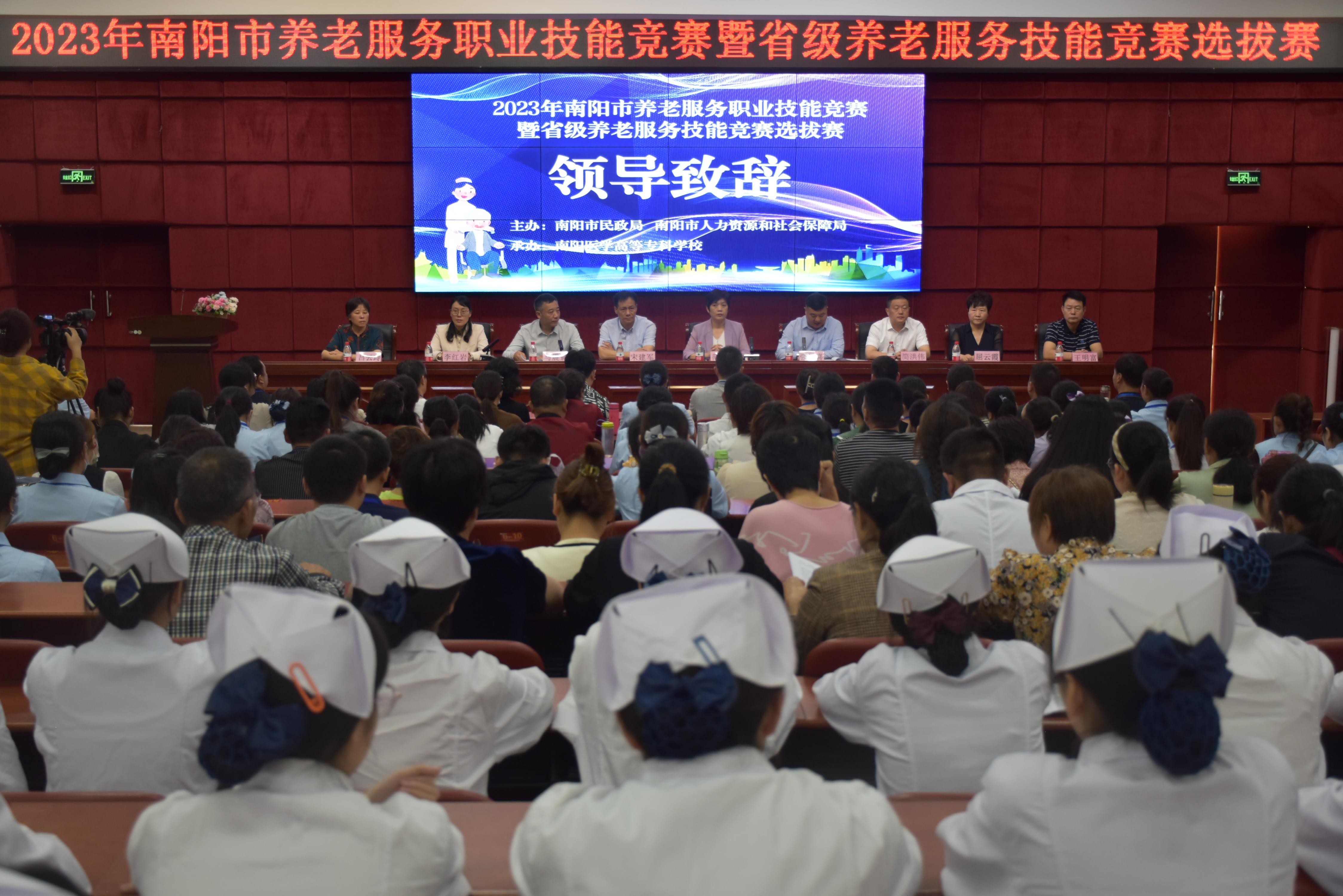 范真致辞,对与会领导和参赛选手的到来表示热烈欢迎,并简要介绍了学校发展历史和近年来取得的成绩。强学喜强调,全市各级各类人员要高度关注我市的养老事业,切实增强养老服务意识,在建好养老设施和用好南阳的“康养宛军”队伍的同时,要建立健全养老服务人才的培养、使用、评价、激励机制,为扎实推进全省养老服务工作“强基工程”和现代化的省域副中心城市建设做出新的更大贡献。