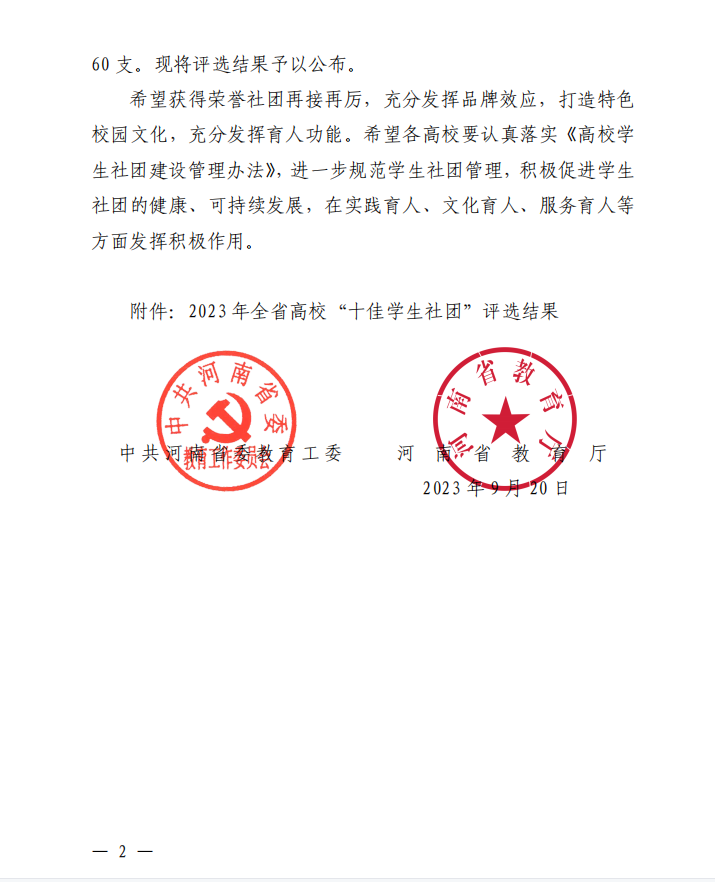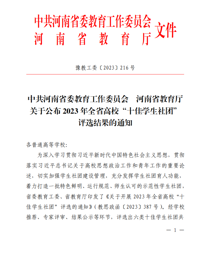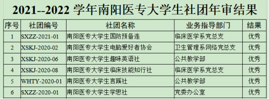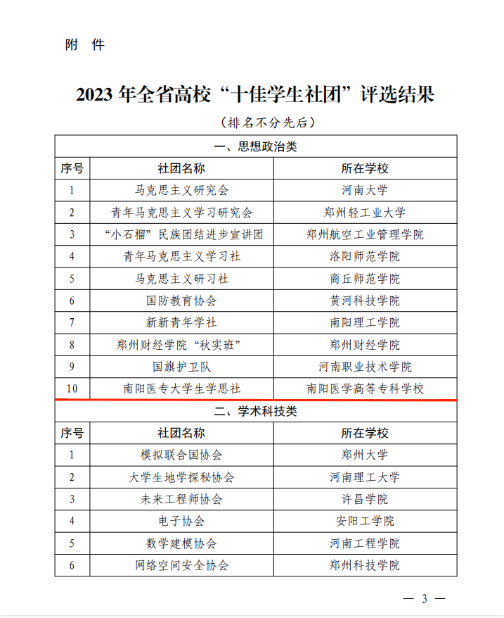 本网讯(校团委 庞博)近日,河南省委教育工委、河南省教育厅下发了《中共河南省委教育工作委员会 河南省教育厅关于公布2023年全省高校十佳学生社团评选结果的通知》,全省共评选出6 类十佳学生社团共 60 支。我校学生社团喜获佳绩:南阳医专大学生学思社荣获2023年河南省普通高等学校“十佳学生社团”(业务指导部门:组织部、统战部),我校思想政治类学生社团首次荣获该奖项。
