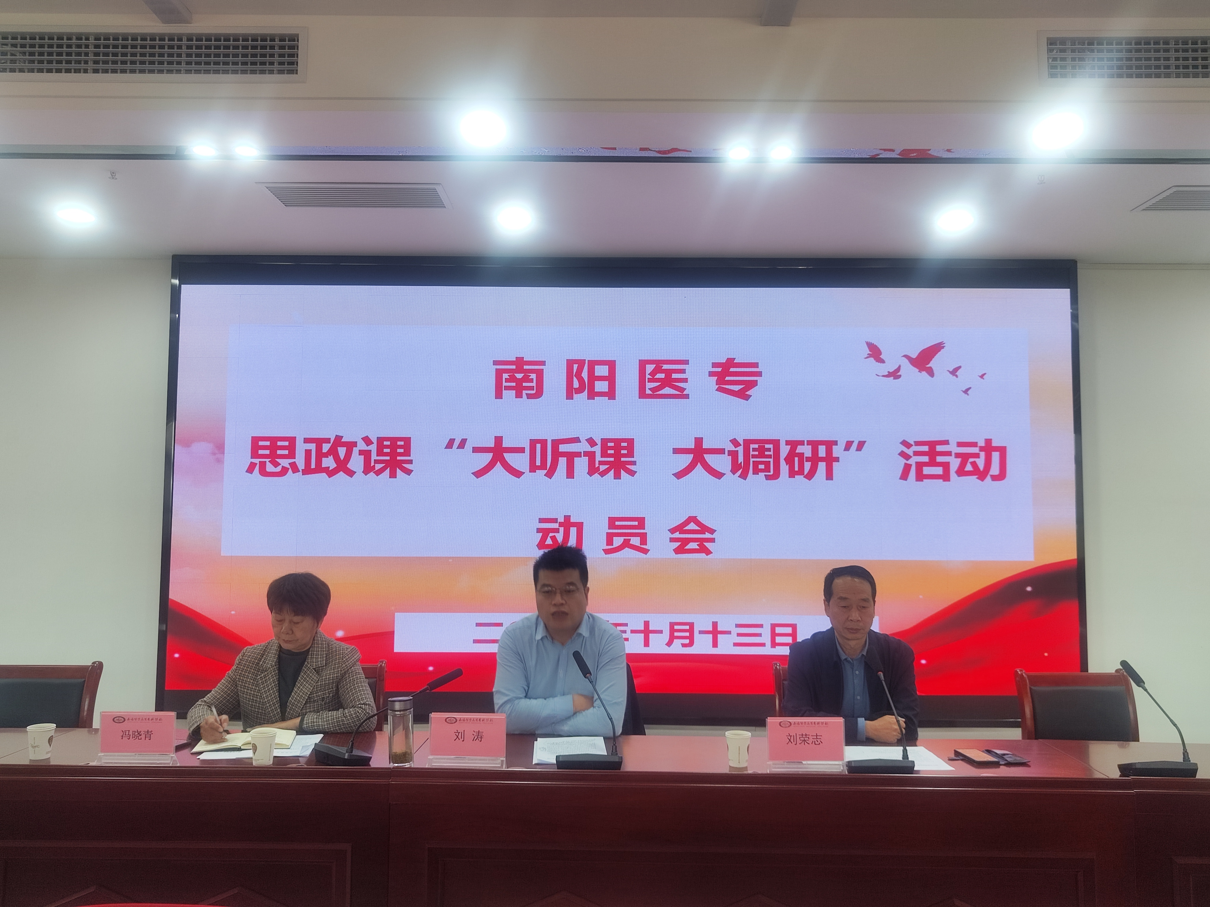 本网讯(文/马克思主义学院 何义霞)10月13日,根据中共河南省委教育工委办公室 河南省教育厅办公室《关于开展2023 年度全省高校秋季学期思政课“大听课 大调研”活动的通知》要求,我校召开了2023年秋期思政课“大听课 大调研”活动动员会,对相关工作进行安排部署。党委副书记刘涛出席会议并讲话,校纪委相关人员、马克思主义学院班子成员及全校思政课教师参加会议,校党委委员、副校长刘荣志主持会议。