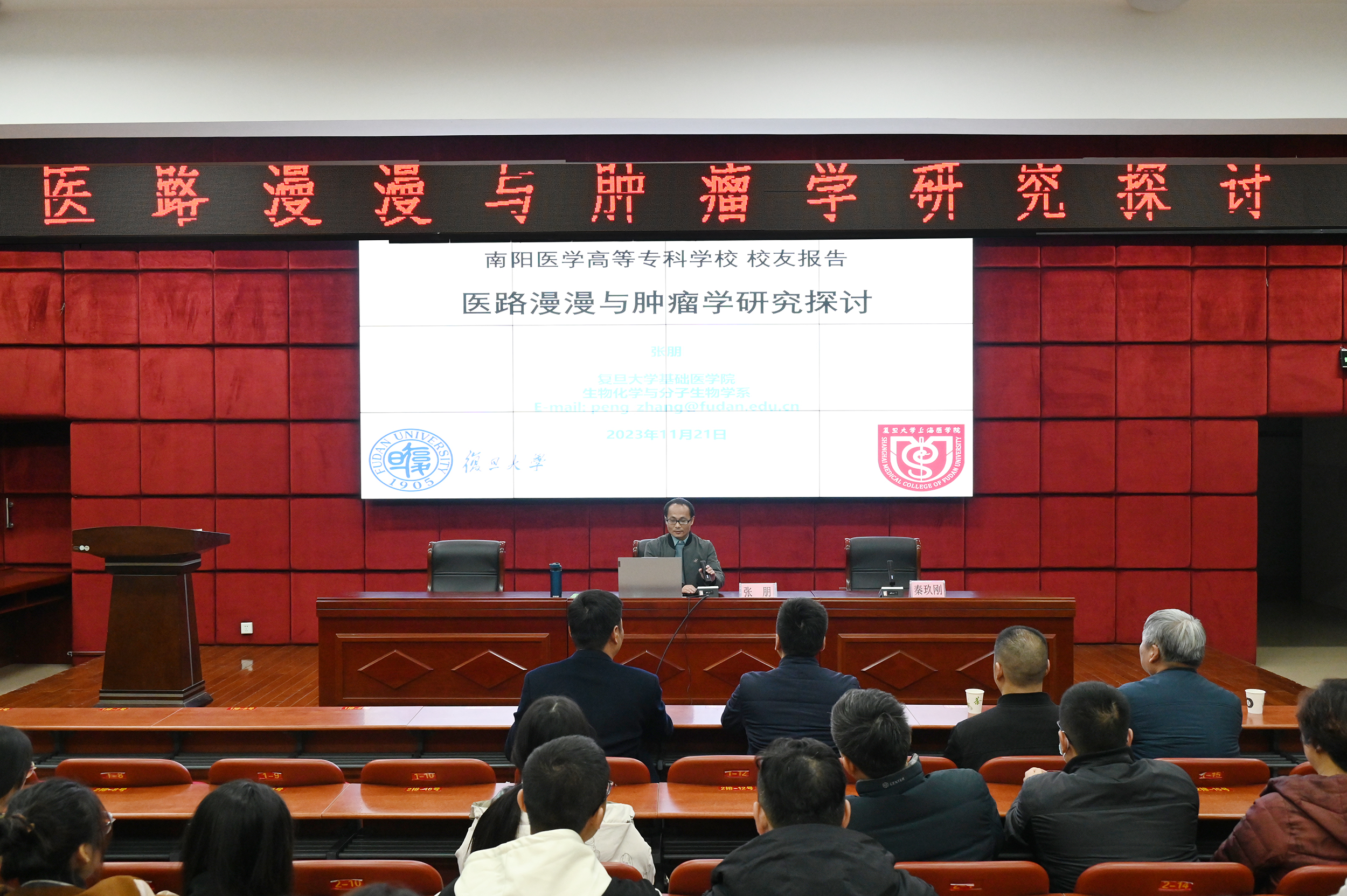 本网讯(文/就业创业处 杜婧)浓浓母校情,依依校友心。1120日晚,医路漫漫与肿瘤学研究探讨专题报告会在我校图书馆五楼报告厅举办,报告会由我校杰出校友、上海复旦大学基础医学院生物化学与分子生物学系副研究员、美国威斯康星医学院博士后张朋讲授,校党委委员、副校长秦玖刚出席并主持报告会,临床医学系、基础医学部40余名教师及200余名在校学生参会。报告会采用线上线下相结合的模式同步进行。