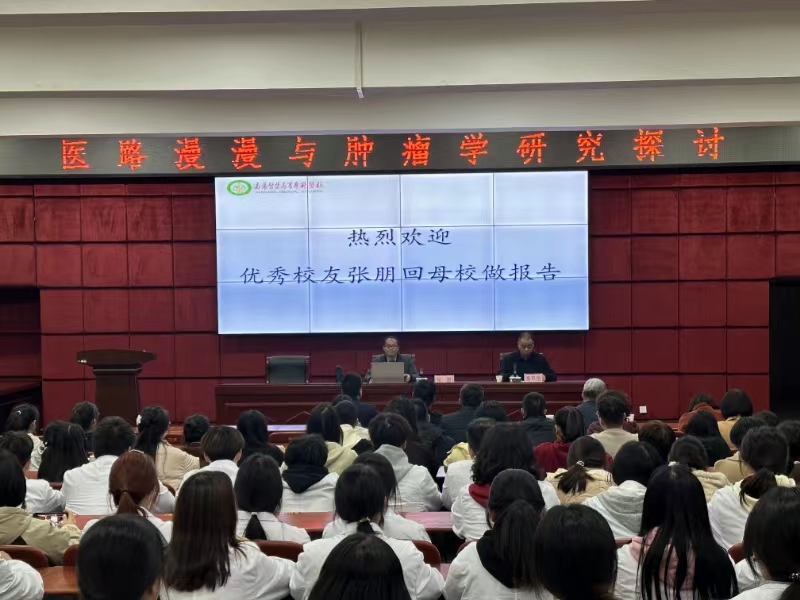 张朋结合自身学习与工作的经历,从医路历程、肿瘤学研究浅谈、医学学习过程中的一些个人感悟三方面进行了分享、交流,详细介绍了胰腺癌、前列腺癌的产生、特点以及治疗,鼓励新一代的学弟学妹坚定自己的目标,树立良好的就业观,无论学习还是生活,既要抓住机遇、志存高远,也要脚踏实地、行稳致远,为我校师生上了一堂内容丰富、内涵深远的一课。讲座现场不时传来阵阵掌声,同学们纷纷表示在今后的学习生活中,要以优秀校友为榜样,积极树立远大目标和人生理想,感恩母校,回馈社会。