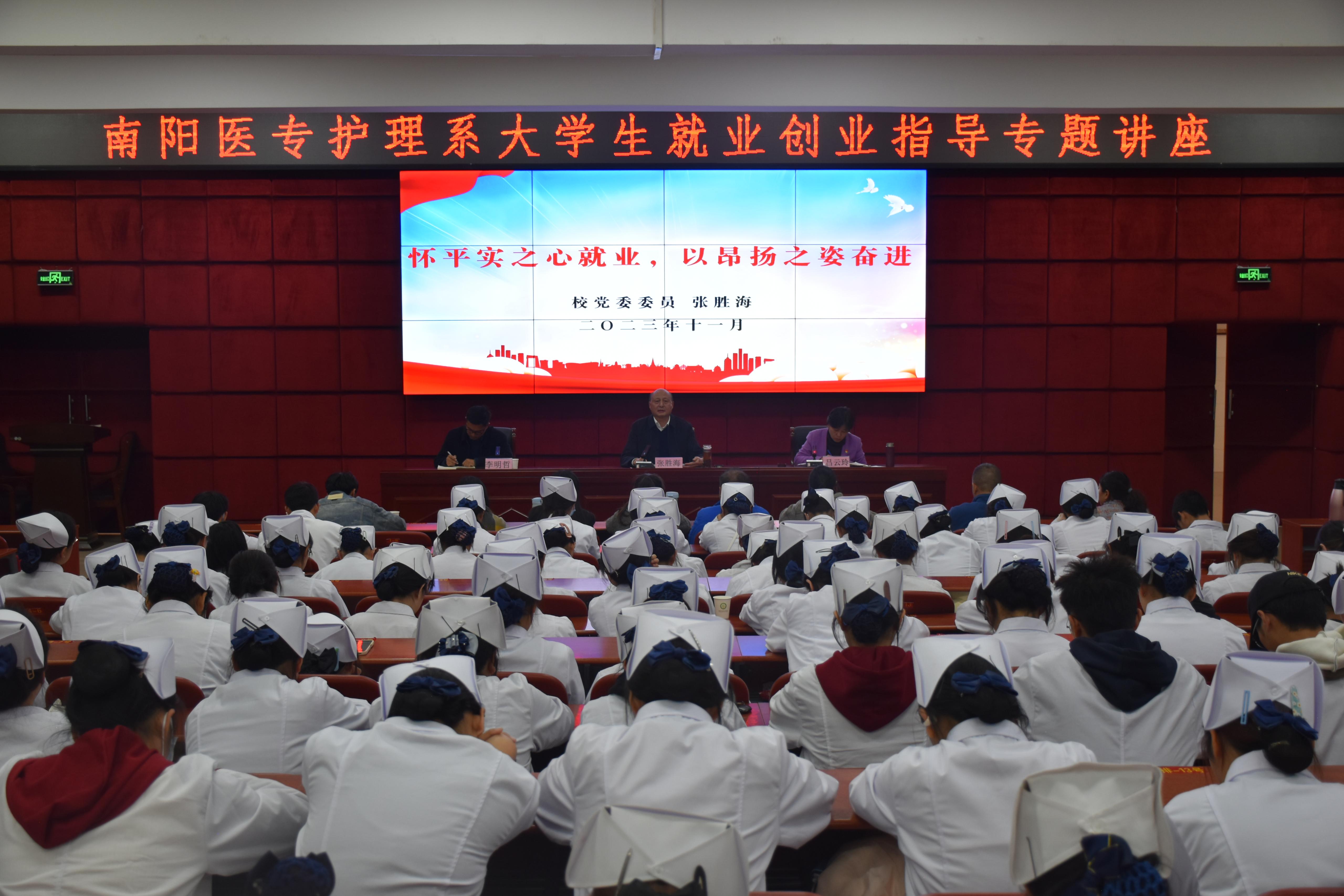本网讯(文/护理系  何红丽)为教育和引导广大学生正确认识就业形势,提高就业应对能力,1123日下午,校党委委员张胜海在仲景西区图书馆5楼报告厅为护理系学生作题为《怀平实之心就业,以昂扬之姿奋进》的专题讲座,护理系行管干部和全体辅导员参加,护理系主任吕云玲主持讲座。