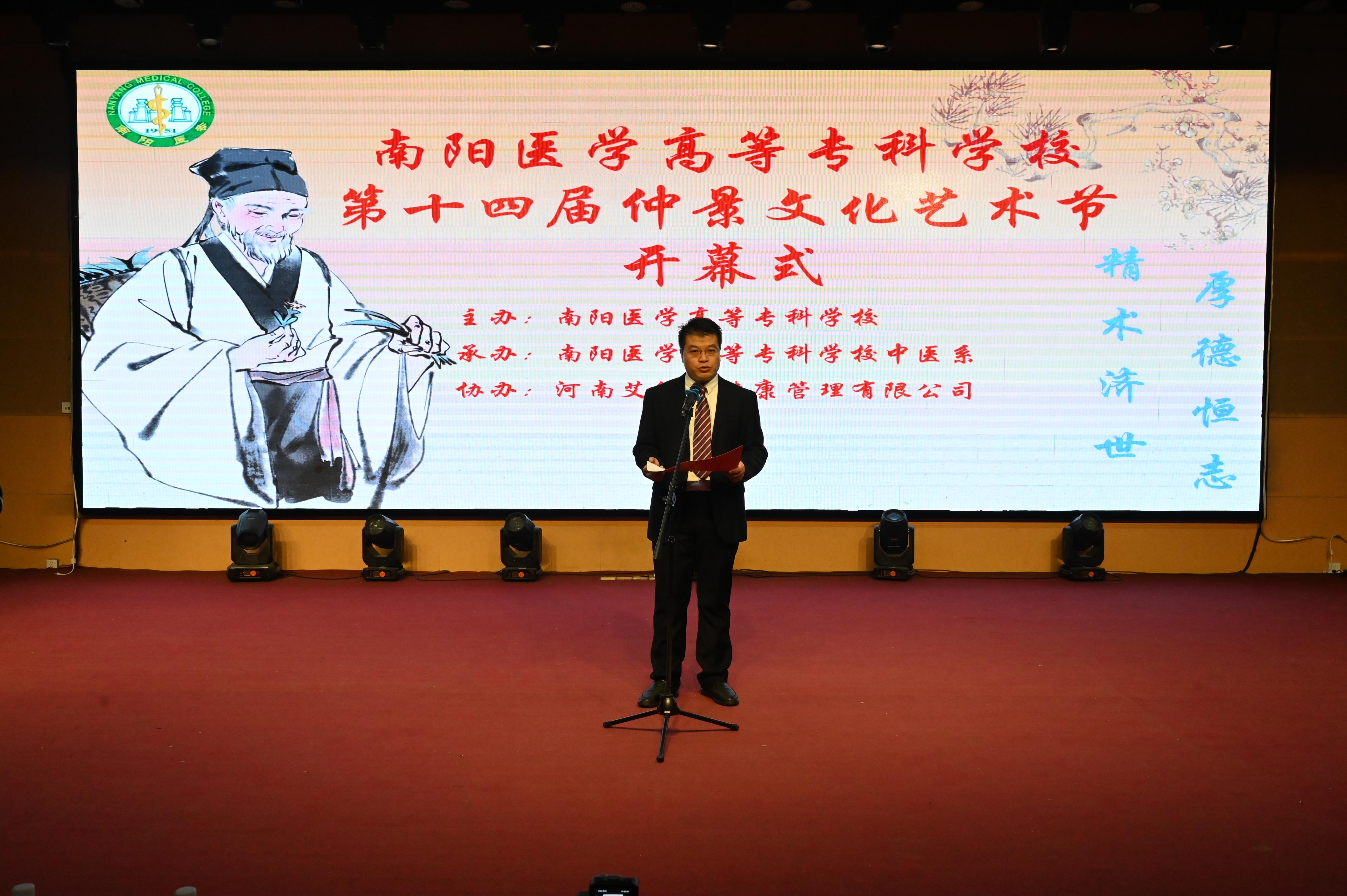 刘涛为艺术节致辞,希望仲景学子们能够以仲景文化艺术节的举办为契机,弘扬仲景文化、掌握扎实技能、提升科学素养、明确就业方向,让仲景文化在守正创新中焕发新光彩。