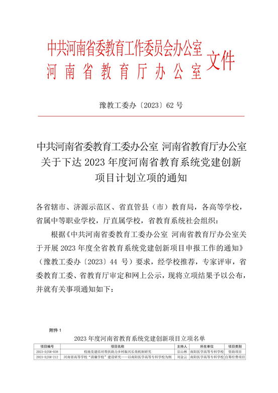 本网讯(文/临床医学系 王静)近日,中共河南省委教育工委办公室、河南省教育厅办公室下发2023年度河南省教育系统党建创新项目计划立项的通知,我校《校地党建结对帮扶助力乡村振兴长效机制研究》和《河南省高等学校“清廉学校”建设研究——以威客电竞·(中国)VK GAMING,为例》两个项目获批立项。