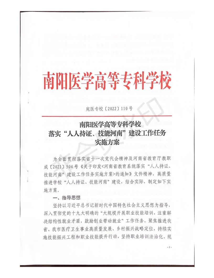南阳医专关于落实“人人持证、技能河南”建设工作任务实施方案
