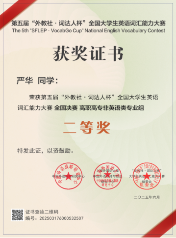 在国赛的赛场上,中医系严华同学凭借扎实的词汇量与出色的临场表现,最终斩获国赛二等奖!本次佳绩的取得,彰显了我校对于医学生英语学习的重视以及在人才培养方面的育人成效。(编审 华俊皓)