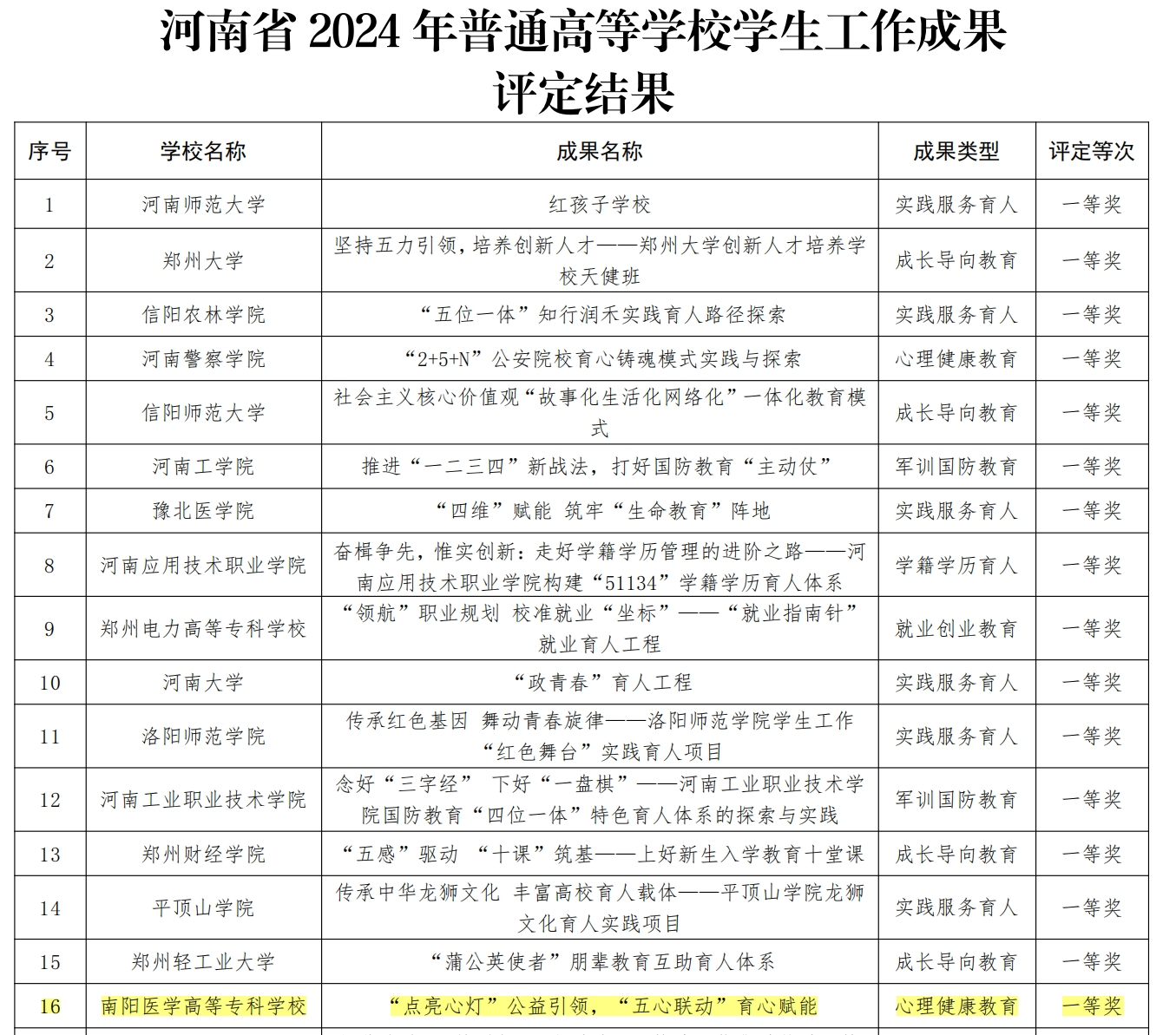本网讯(文/心理健康关爱与教育中心 李孟辉)近日,我校申报的《“点亮心灯”公益引领,“五心联动”育心赋能》在河南省2024年度普通高等学校学生工作成果项目评选中荣获一等奖。