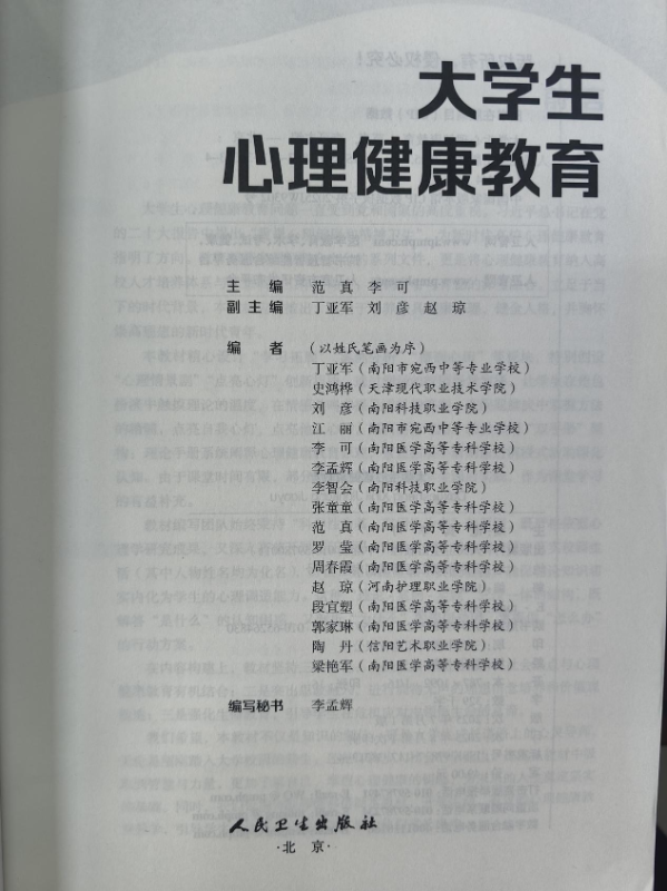 本网讯(文/心理健康关爱与教育中心 李孟辉)近日,我校主编的高等学校新形态教材“点亮心灯 逐光前行”《大学生心理健康教育》由人民卫生出版社正式出版,发行使用。