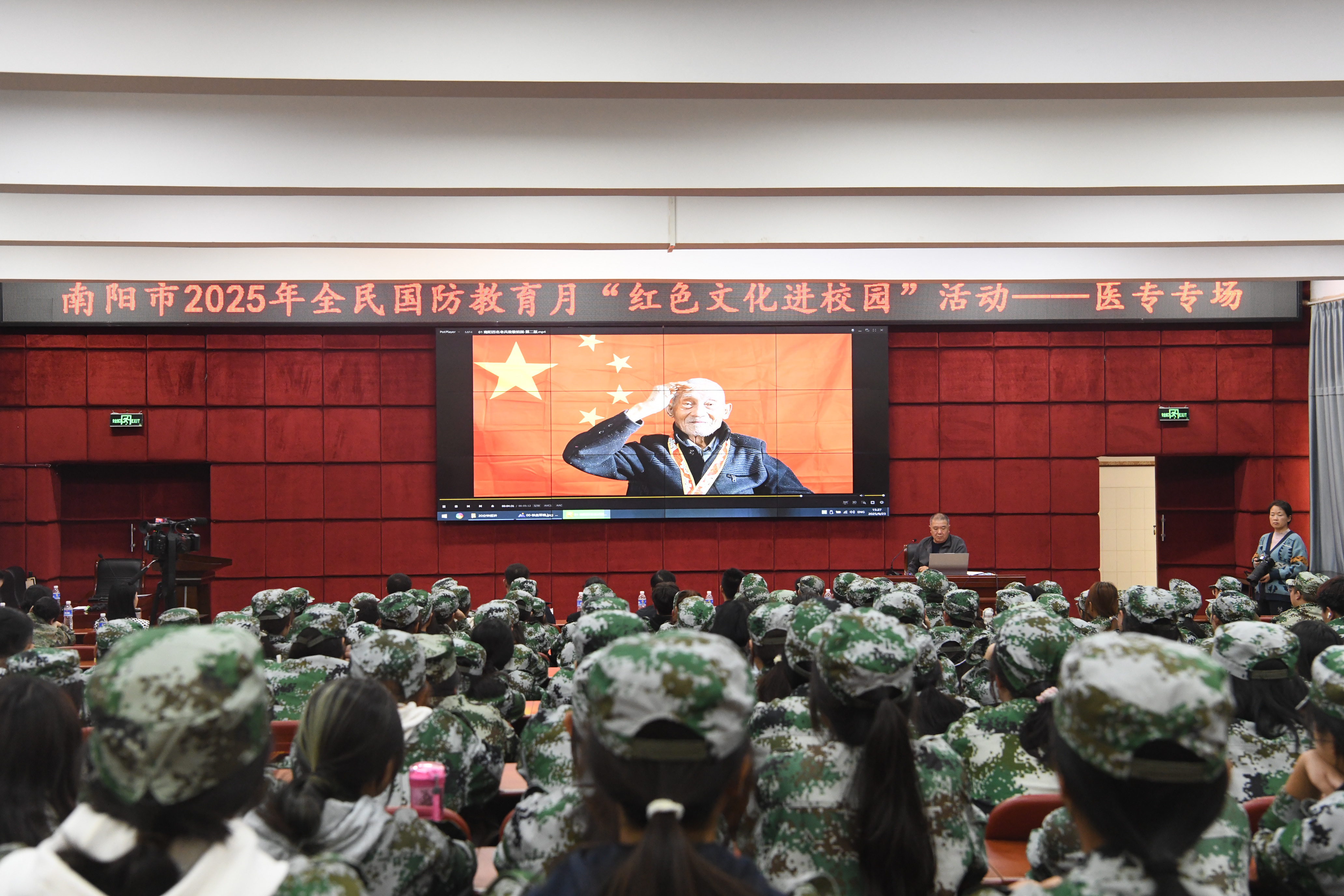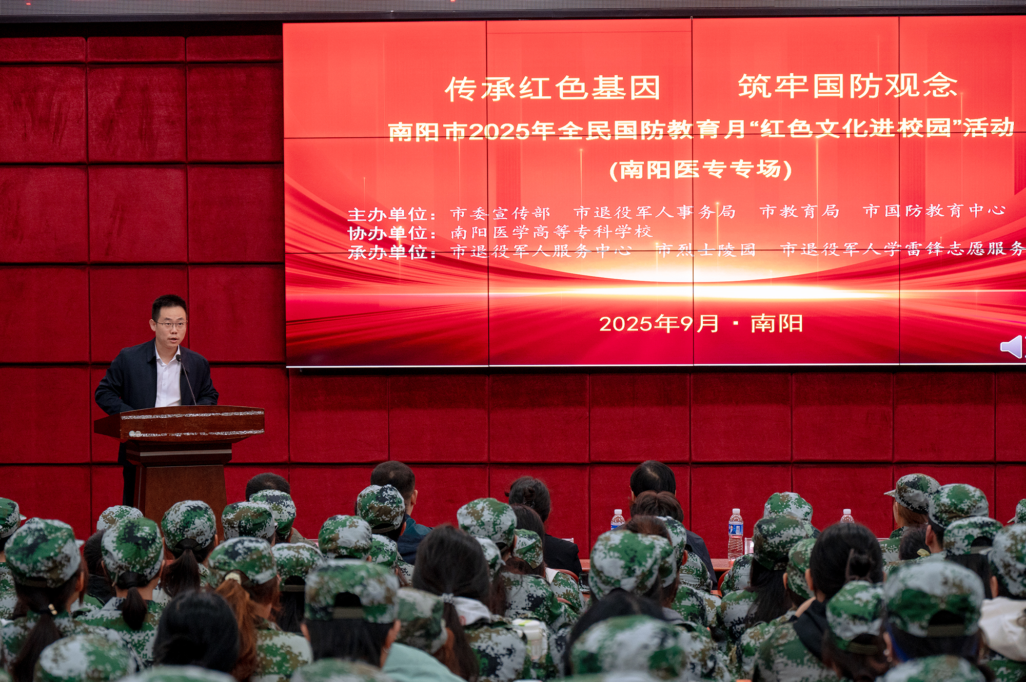 本网讯(文/学生处 皇甫乐观)9月23日下午,南阳市退役军人事务局与我校联合主办的“红色文化进校园”活动在我校举行。活动以“传承红色基因 筑牢国防观念”为主题,是南阳市2025年全民国防教育月活动之一。市退役军人事务局党组成员、副局长孔令金,市国防教育中心副主任马黎,市退役军人事务局机关党委专职副书记张海山,南阳医专副校长王岩出席。学校相关部门负责同志、师生代表参加。活动特邀市退役军人事务局红色教育宣讲团马秀华等8名成员。