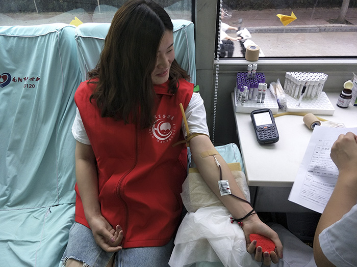 参加献血的邹腊梅同学是第一次献血,但是她全程微笑着,眼中没有一丝害怕,她的勇气值得我们敬佩。献完血之后她说:“我是有一点紧张的,但是献完血感觉挺好的,献血既可以促进自身血液循环,又可以帮助其他有需要的人”。
