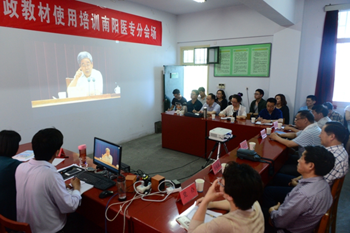 本网讯(文/政教部李建效)为帮助广大思政课教师更好地把握高校思想政治理论课2018年版教材的主要内容和基本精神,切实用好新教材,根据教育部、省教育厅《关于组织参加高校思想政治理论课2018年版教材使用培训的通知》要求,学校在政教部会议室设置了全国高校思政课2018年版教材使用远程视频培训分会场。校长方家选、副校长逵应坤,党办、宣传部、教务处负责人及政教部全体专兼职教师参加了5月14日下午教育部组织的开班仪式。