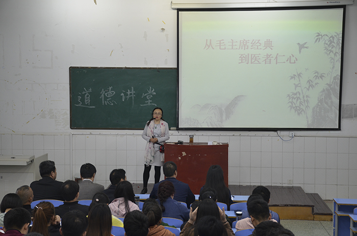本网讯(文/临床系 王静)4月12日下午,我校在4号教学楼503教室举办2018年第一期道德讲堂。本期道德讲堂以“从毛主席经典到医者仁心”为主题,由临床医学系承办,二百余名师生参加活动。