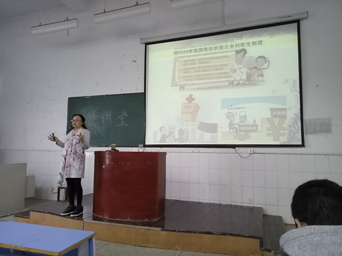 临床医学系副主任李玲担任主讲。她从毛泽东的《十六字令·山》引入,带领大家领略毛泽东诗词的博大开阔和气势磅礴。从组诗《送瘟神》中体会毛泽东对人民疾苦的深切关怀和对医疗卫生事业的高度重视。李主任结合全科医生培养制度改革和学生专业学习,讲解了经典老三篇《为人民服务》、《纪念白求恩》、《愚公移山》,勉励同学们要学好为人民服务的本领,以仁心施仁术,成为祖国需要的合格医学人才!