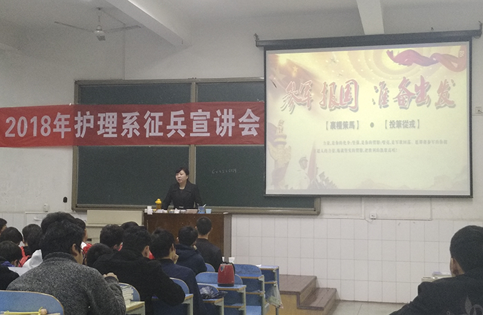 余飞海从大学生应征入伍的意义、条件、优惠政策、入伍流程四个方面给同学们进行了全面宣讲,他鼓励同学们响应祖国号召,投身国防建设,在军营这所大学校、大熔炉里成长成才、建功立业。护理系现役士兵15普大护理8班学生郭畔旭将自己的从军日记 “第一次打枪”等文章和部队的新兵训练、军营生活等方面和同学们真诚分享了他入伍后的收获和感悟。梁顺平书记强调,参军入伍“利国、利民、利家、利己”,她希望同学们向现役学生士兵看齐,把个人理想抱负融入强军梦、中国梦,携笔从戎献身国防,丰富人生经历,磨练身心意志,为实现中国梦、强军梦贡献自己的青春和才智。