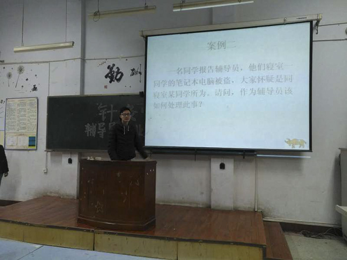 比赛中,全体参赛人员精神饱满,沉着应战,表现出了过硬的专业素养。在笔试中奋笔疾书,认真思考答题;在主题班会中充分展示辅导员思想教育工作的理念设计、现代科技技术的运用技巧等;案例分析中教师们结合工作实际,抓住问题实质,分析到位,措施合理,以扎实的学生工作基本技能,敏捷的思辨能力获得在座师生阵阵热烈掌声。