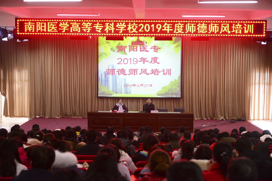 本网讯(文/教务处 梁亮)人勤春来早,万事日相催。2019年2月27日下午,南阳医专在新东区报告厅开展了2019年度师德师风教育培训活动。学校全体专兼职教师参加了培训,本次活动由校党委委员,副校长范真主持。