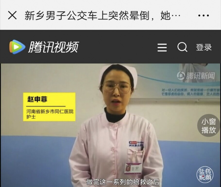 面对晕倒在地的乘客,赵申菲立即跪地施救,测脉搏、问病史、胸外按压、清理呼吸道、不慌不乱,有条不紊,直到病人苏醒过来。公交车上的监控记录下了这一切。