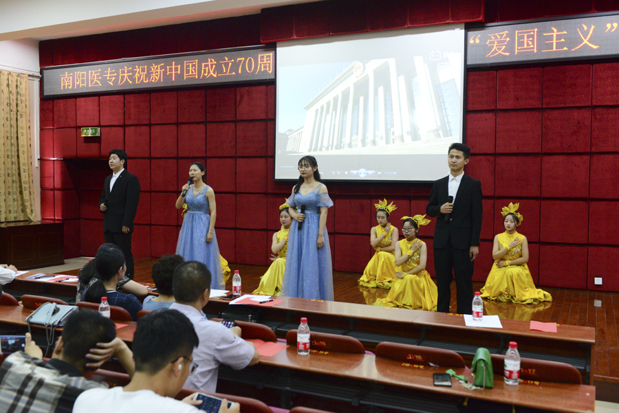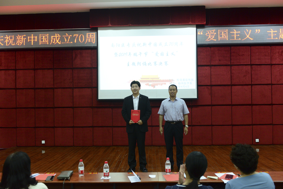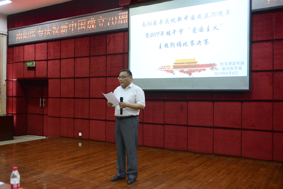 本网讯(文/临床医学系 王静)为深入贯彻落实党的十九大和全国、全省教育大会精神,传承中华优秀传统文化,大力弘扬以爱国主义为核心的民族精神,引导广大师生树立正确的历史观、民族观、文化观,进一步增强文化自信,培养爱国之情,6月4日,我校在图书馆五楼报告厅举办庆祝新中国成立70周年暨2019年端午节“爱国主义”主题朗诵比赛。校党委副书记逵应坤出席活动并致辞;党办副主任王萍、组织部副部长孙超丽、宣传部副部长杨金运、工会女工文体部主任白峰、临床系辅导员刘岩担任比赛评委;各系部院师生300余人观看了比赛。