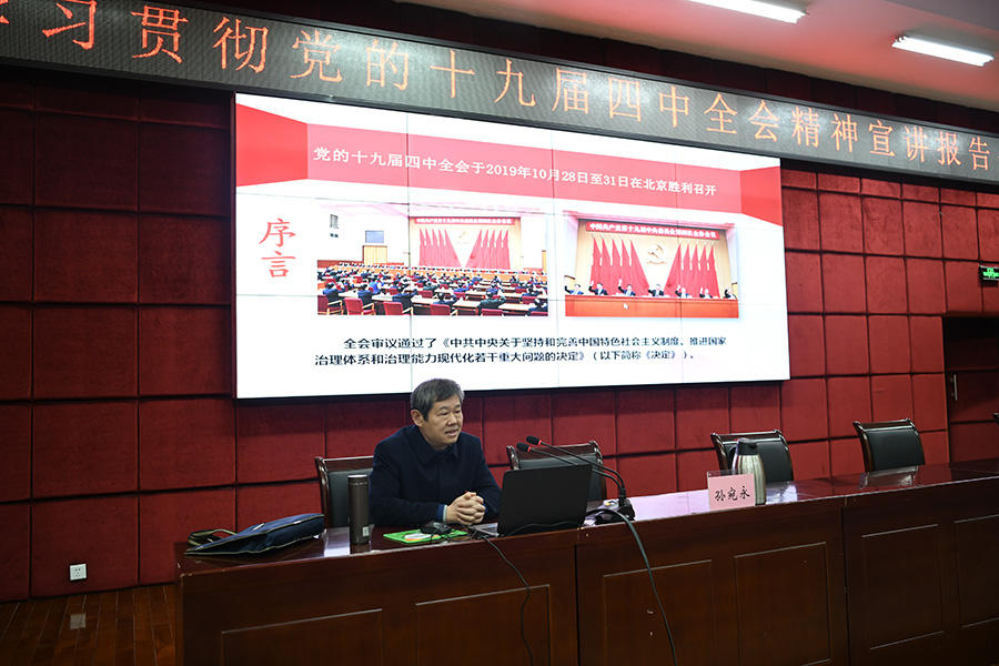 报告会上,孙校长以《深入学习贯彻党的十九届四中全会精神》为题,从充分认识坚持和完善中国特色社会主义制度、推进国家治理体系和治理能力现代化的重大意义;深刻领会中国特色社会主义制度和国家治理体系的显著优势,坚定中国特色社会主义制度自信;准确把握坚持和完善中国特色社会主义制度、推进国家治理体系和治理能力现代化的总体要求、总体目标和重点任务;加强党的领导,确保全会确定的各项目标任务全面落实到位四个方面,对十九届四中全会精神进行深入系统的解读,报告内容丰富、阐释精准、事例鲜活、深入浅出,有很强的思想性、针对性、指引性和感染力,为全校师生员工认真学习和深刻把握党的十九届四中全会精神,提供了非常有益的指导。