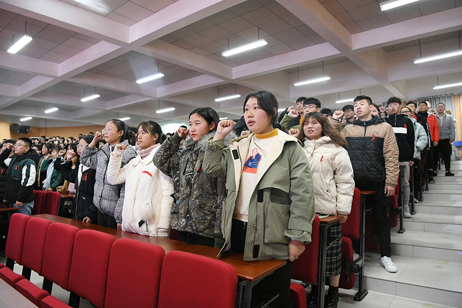 活动在欢快的健美操表演中拉开帷幕。在访谈环节,来自南阳市防艾一线的丁琳、魏顺远、安红波三位专家详细讲解了艾滋病的病因、传播途径、危害、检测、预防措施等七个方面知识,现场还设置了有奖问答活动,师生踊跃参加。刘岩老师一首《爱的奉献》、卫生管理系同学表演的手势舞《堂堂正正一辈子》将现场气氛推向高潮。最后,活动在志愿抗击艾滋病的庄严宣誓声中圆满结束。