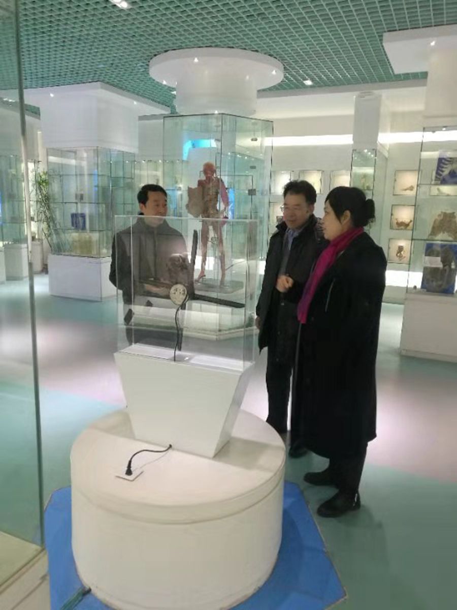 本网讯(文/基础医学部 时炳钦)12月5日上午,南方医科大学丁自海教授对我校人体生命科学馆进行考察和指导。副校长范真、基础医学部主任刘荣志陪同考察。这是丁自海教授第二次对人体科学生命馆进行考察,对信息化提升后的人体生命科学馆赞叹不已。他指出智能化、虚拟化、信息化数字标本馆符合解剖学的发展方向,既满足了教学需要,又兼顾了科研和科普功能。特别是对刘荣志主任提出的“进得来,坐得住,学中做,做中悟”的建馆理念高度赞扬,这一理念引领了医学院校人体解剖标本馆的建设方向,人体生命科学馆必定会成为弘扬仲景文化、展示我校风采乃至南阳的一张名片。