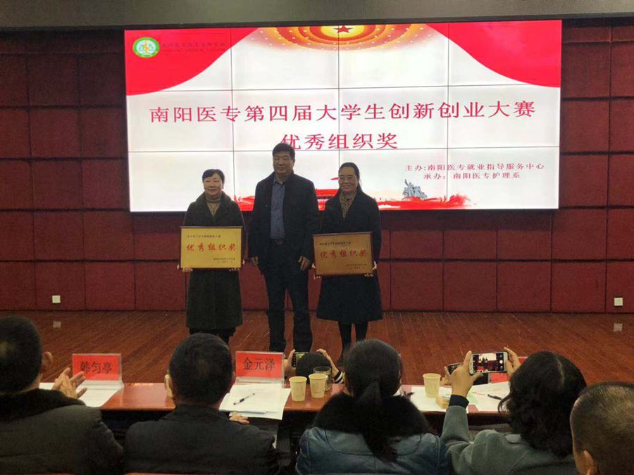 本网讯(文/学生处 张辉)12月19日晚,由学校就业中心主办、护理系承办的第四届大学生创新创业大赛在主校区图书馆五楼学术报告厅圆满落下帷幕。校党委委员、副校长郭万周出席比赛并致辞,系院领导、辅导员、项目指导老师、150余名学生观众观摩了比赛。十个参赛团队参加了此次比赛。河南省首批大学生就业指导名师、南阳师范学院教授张炳兰,河南工业职业技术学院招生就业处处长胡雪梅,南阳农业职业学院招生就处处长金元泽,南阳理工学院招生就业处副处长丁伟,我校设备处处长韩匀亭、保卫处处长牛嵩山、教务处副处长王海鑫担任决赛评委。