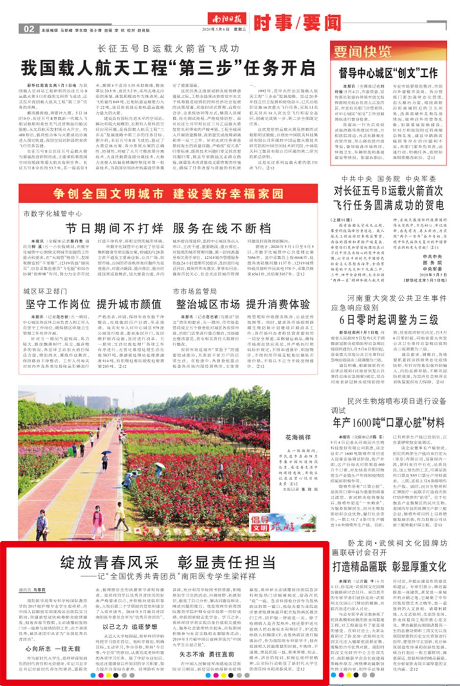 本网讯(文/校团委 马黎莉)五四青年节前夕,共青团中央下发了《共青团中央关于表彰“全国优秀共青团员”“全国优秀共青团干部”“全国五四红旗团委(团支部)的决定”》(中青发[2020]8号)。我校国际教育学院2017级护理专业学生梁祥祥,在中国人民解放军南部战区总医院实习期间,突遇新型冠状病毒肺炎疫情爆发,他放弃春节假期,主动请缨到发热门诊一线参与疫情防控工作,由于表现优秀,被共青团中央评为“全国优秀共青团员”——全国共青团员的最高荣誉,这是我校共青团员首次获此殊荣。2020年5月6日《南阳日报》以《绽放青春风采 彰显责任担当——记“全国优秀共青团员”南阳医专学生梁祥祥》为题刊登了梁祥祥的感人事迹。
