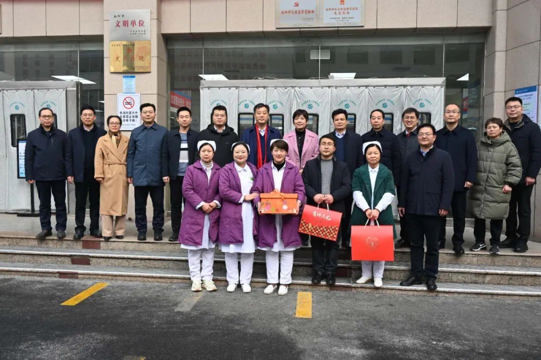 本网讯(文/党政办 刘辉)2月10日,正月初一上午,校长范真、党委副书记刘涛、副校长刘荣志带领党政办、总务处、保卫处、生活服务中心相关负责同志,深入仲景西区、仲景东区、孔明校区和三所附属医院,看望慰问值班值守的教职员工及医务工作者代表,向他们送去新春祝福。