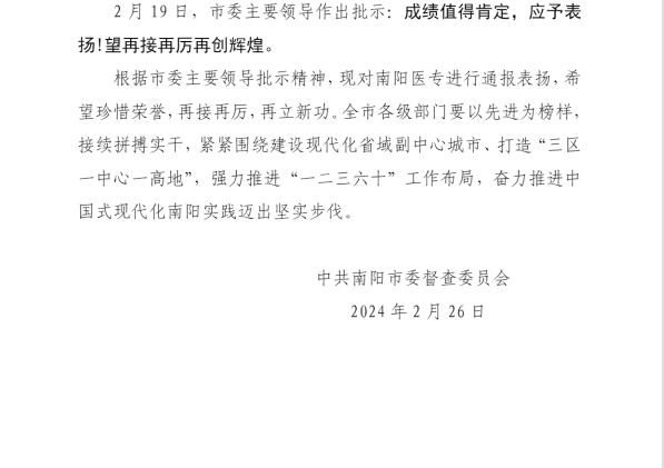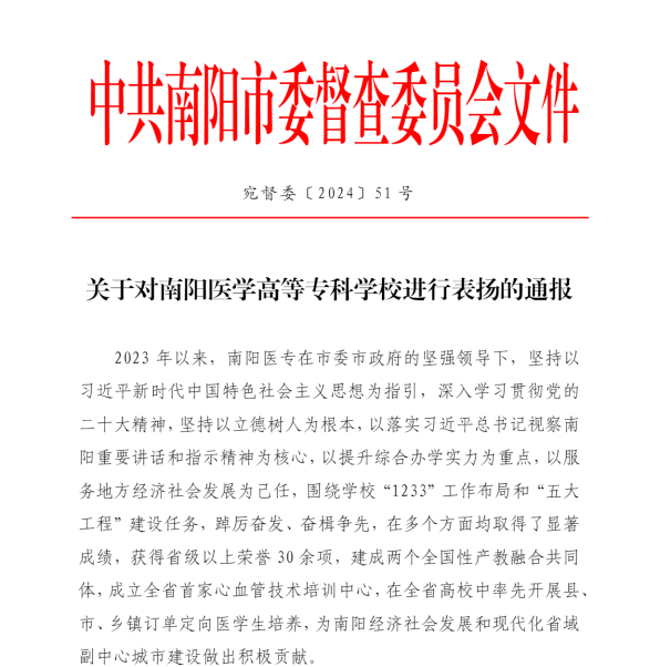近日,中共南阳市委督查委员会下发《关于对威客电竞·(中国)VK GAMING,进行表扬的通报》(宛督委〔2024〕51号),通报了我校2023年在多个方面取得的显著成绩:获得省级以上荣誉30余项,建成两个全国性产教融合共同体,成立全省首家心血管技术培训中心,在全省高校中率先开展县市、乡镇订单定向医学生培养,为南阳经济社会发展和现代化省域副中心城市建设做出积极贡献。