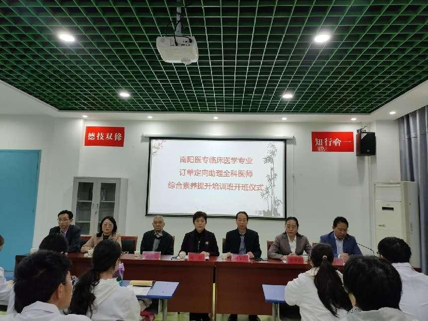 本网讯(文/临床医学系 李林)4月8日上午,南阳医专临床医学专业订单定向助理全科医师第一期综合素养提升培训班开班仪式在实验楼一楼临床医学模拟中心举行。校长范真、副校长刘荣志、“胡氏捻筋法”第三代传人胡胜军出席,中医系主任张明丽,医学技术系主任李玲,临床医学系党总支书记宗山林、副主任周毕军、授课教师代表以及第一期订单定向班全体学员参加开班仪式。开班仪式由副校长刘荣志主持。