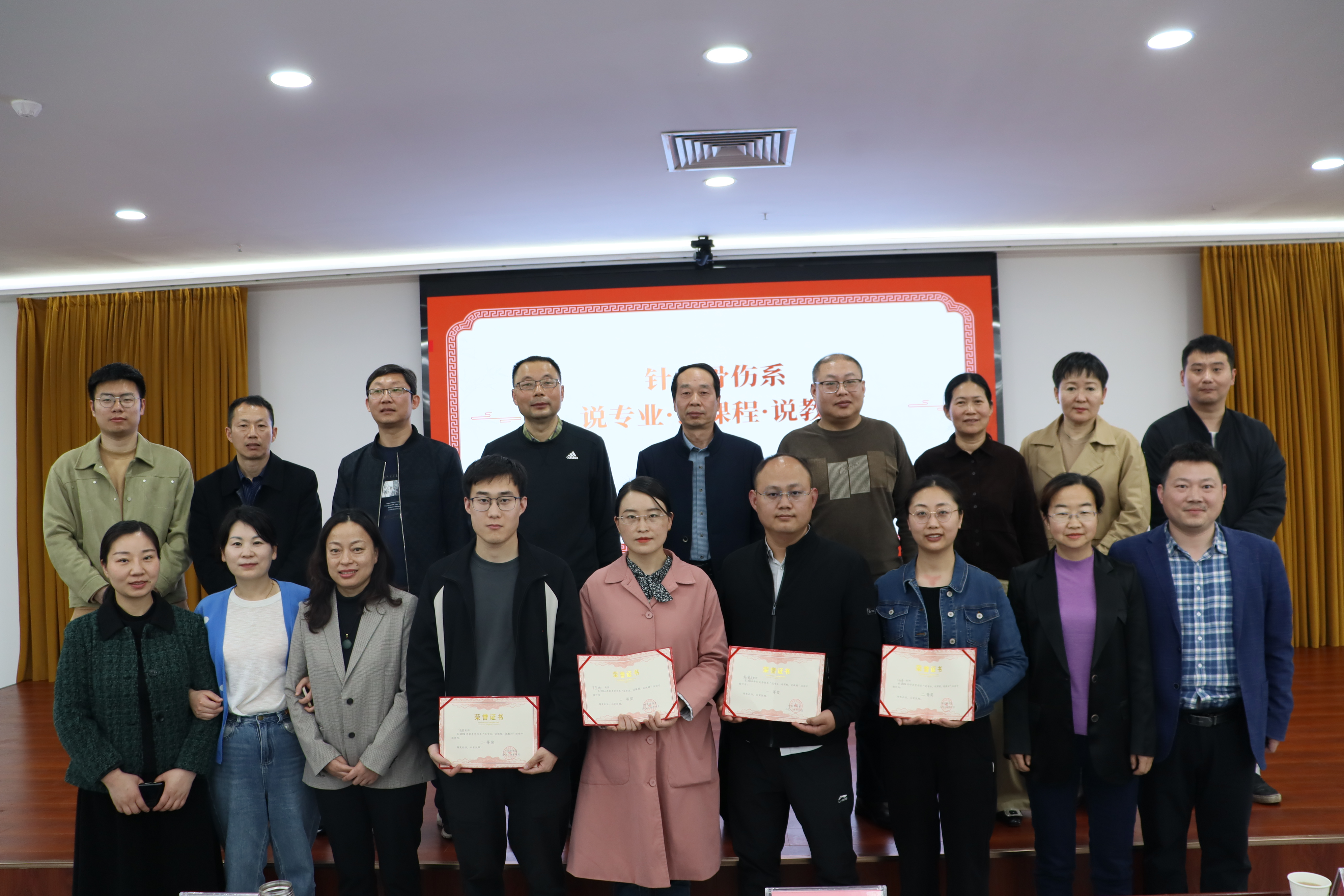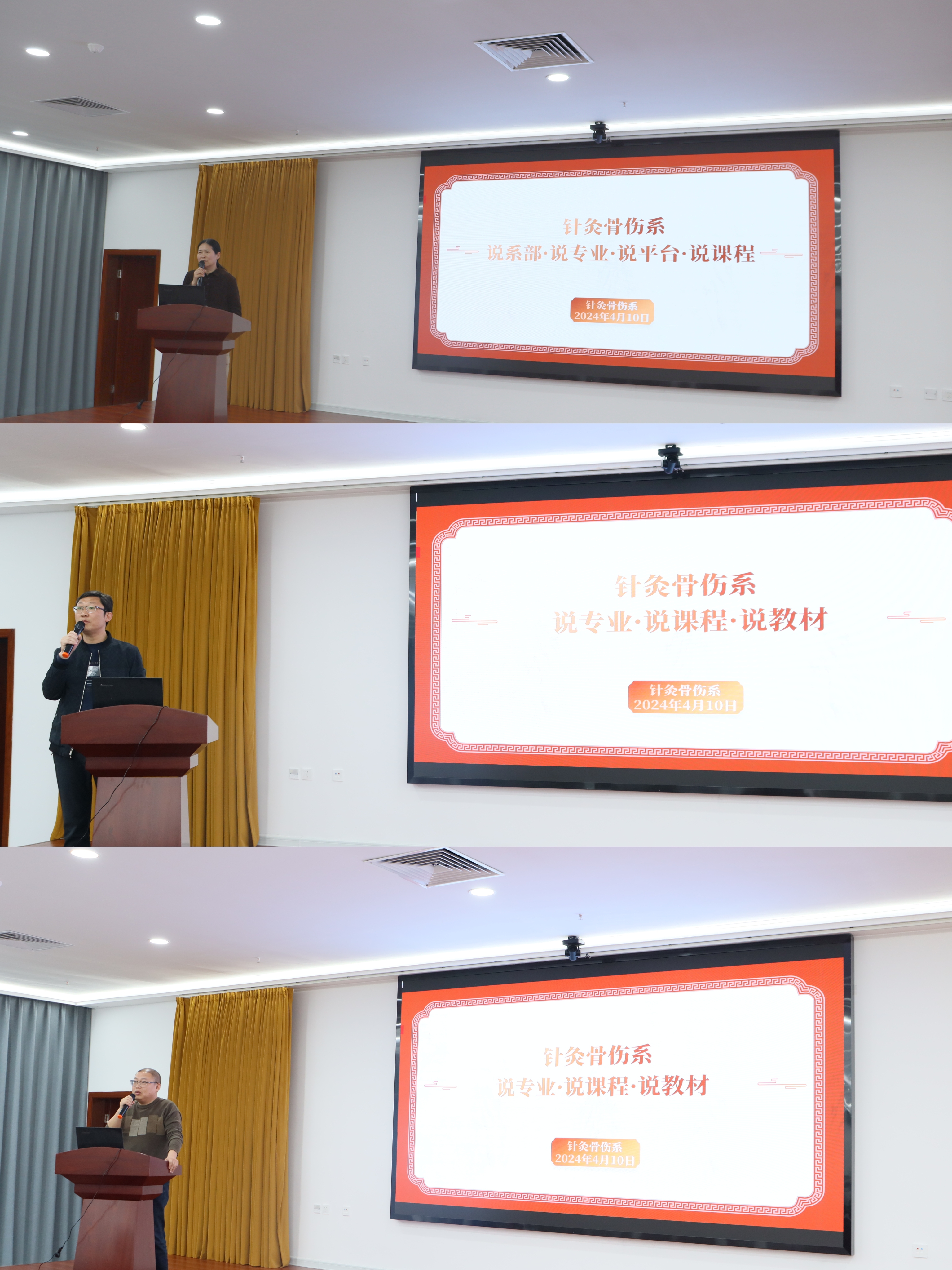 本网讯(文/针灸骨伤系 马驰)为促进针灸骨伤系特色高水平专业建设工作,针灸骨伤系于4月10日下午在仲景文化中心开展“说专业·说课程·说教材”活动。校党委委员、副校长刘荣志,针灸骨伤系党总支书记毕跃忠,质量管理办公室副主任马凤巧,教务处副处长张峰,实验设备管理中心副主任王斌,针灸骨伤系副主任李明哲等班子成员及全体教师参加活动。