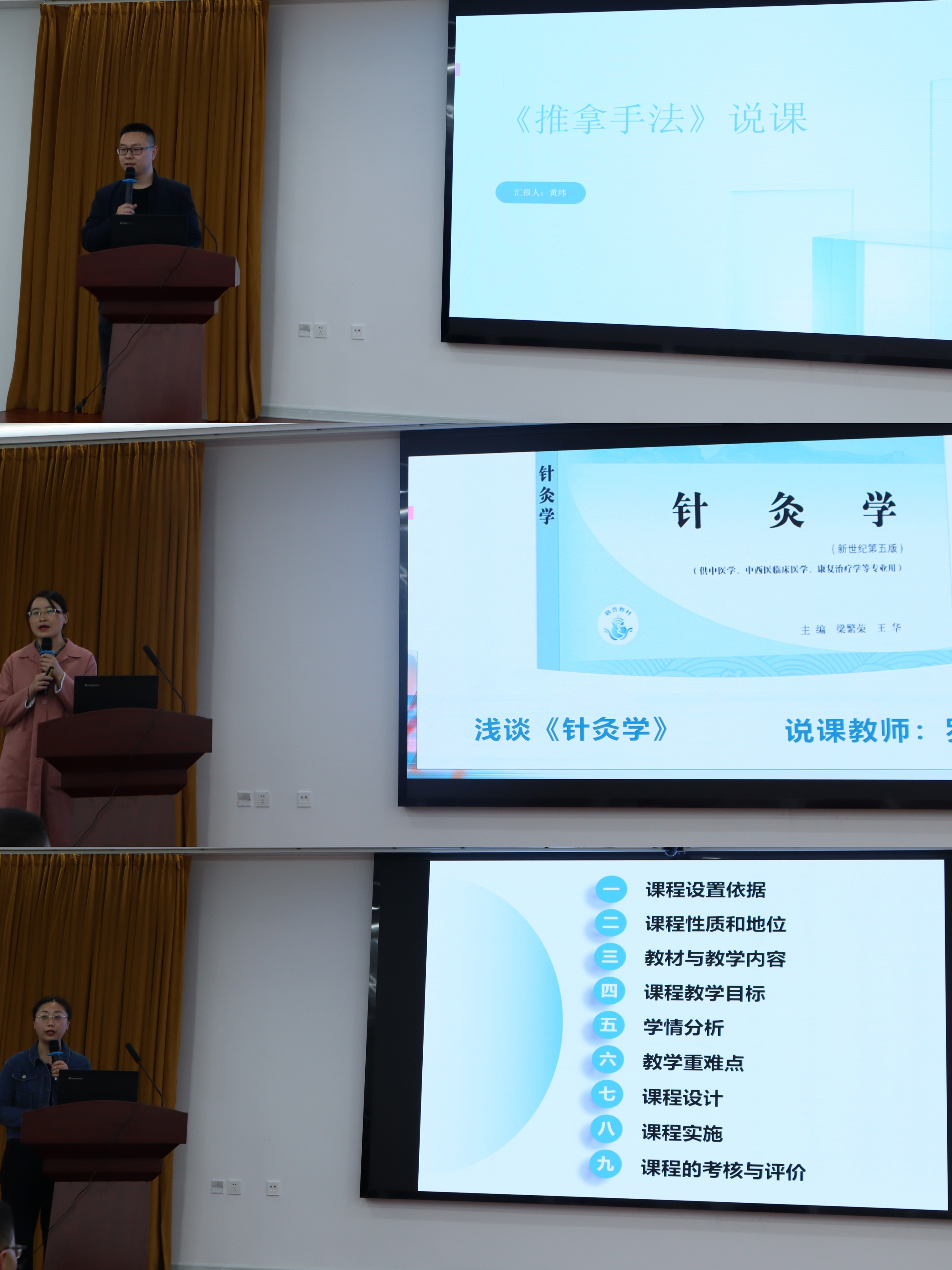 针灸推拿教研室主任刘春梅、中医骨伤教研室主任王冰、实训室主任钱航分别就针灸推拿专业、中医骨伤专业、实训平台建设情况进行了汇报。杨得光等7位专任教师分别结合专业课程进行了精彩展示。最终,杨得光老师获得了一等奖。