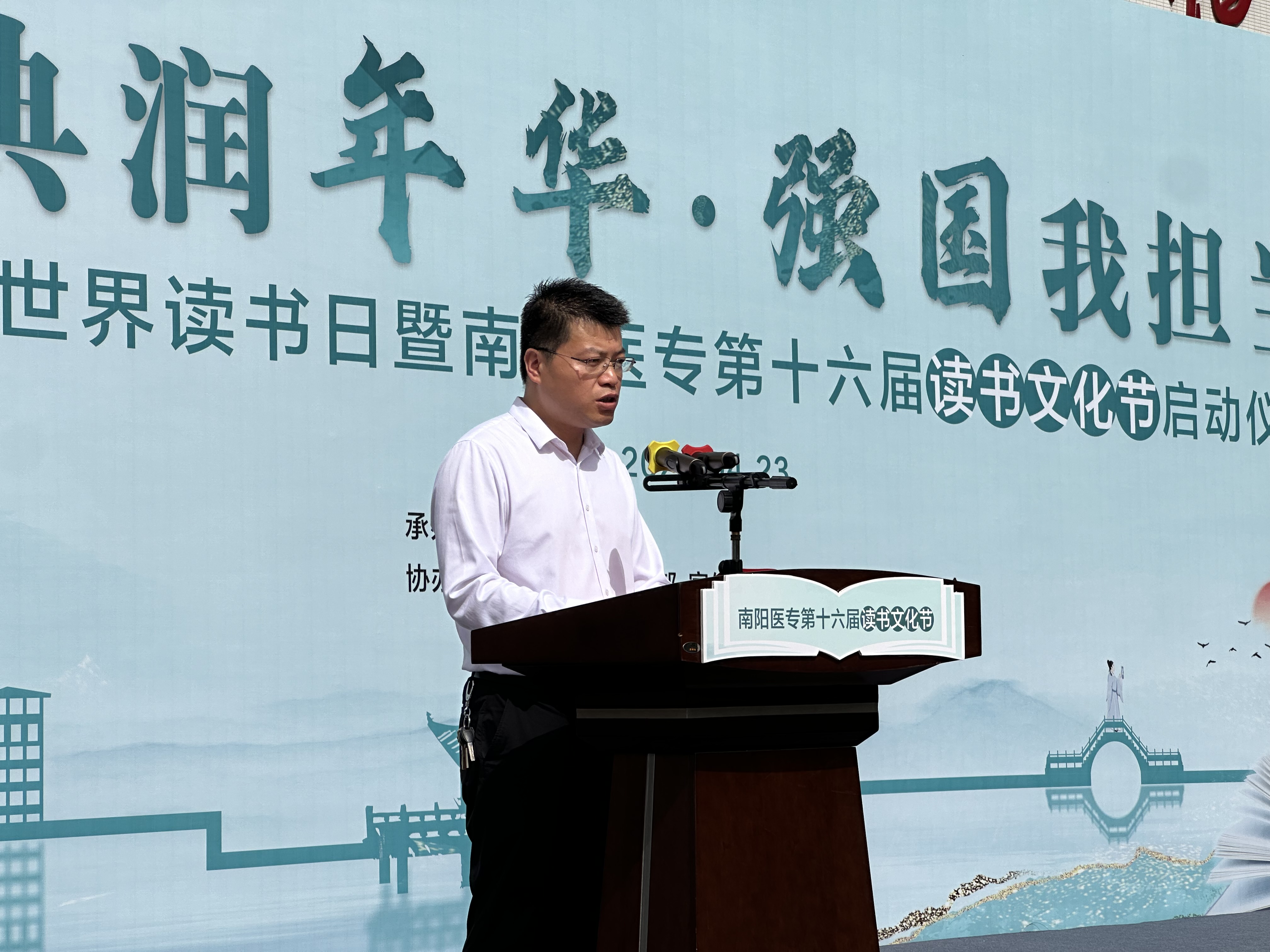 本网讯(文/图书馆 王佳)为深入学习贯彻习近平文化思想,落实党的二十大报告提出的“深化全民阅读活动”要求,庆祝第29个“世界读书日”,4月23日上午,以“经典润年华 强国我担当”为主题的南阳医专第十六届“读书文化节”启动仪式在仲景西区图书馆举行。校长范真、党委副书记刘涛、纪委书记刘金云、工会主席杜晓平,副校长郭延东、刘荣志、秦玖刚出席,各部门负责人及师生代表参加。启动仪式由郭延东主持。线上直播与线下活动同步开展。