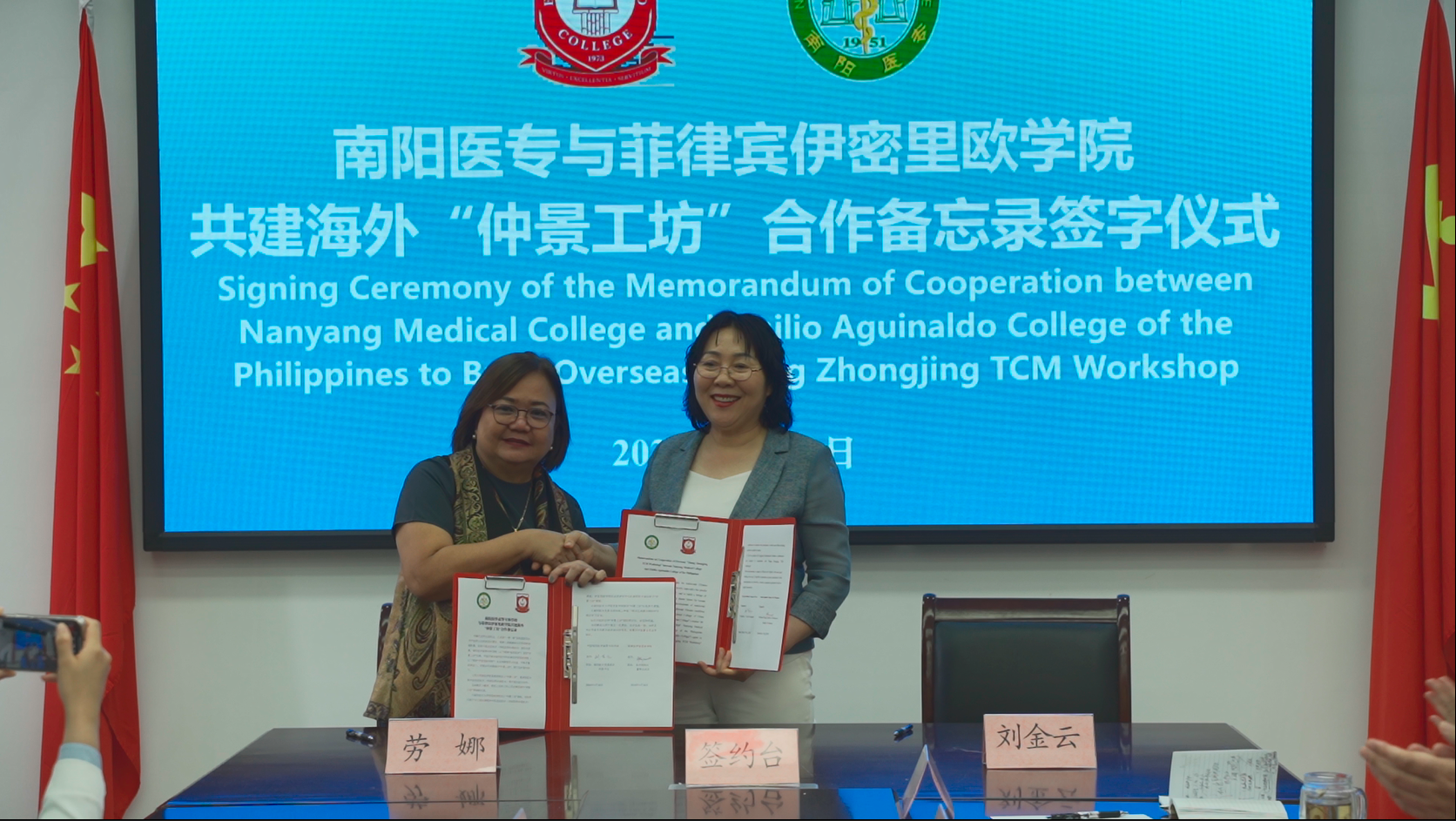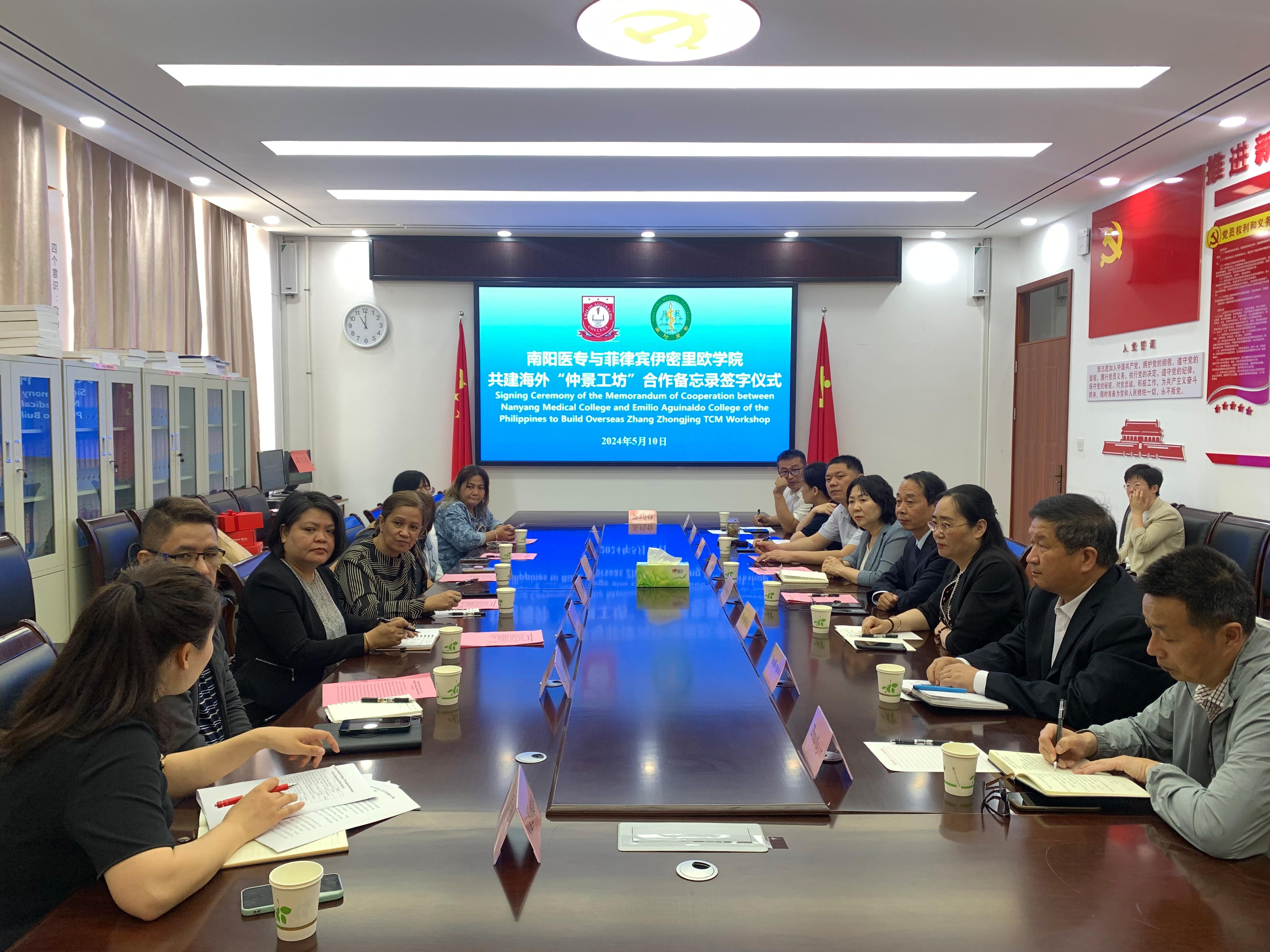 本网讯(文/国际教育学院 李斐)5月10日上午,我校与菲律宾伊密里欧学院共建海外“仲景工坊”合作备忘录签约仪式在仲景西区精术楼423会议室举行。校党委委员、纪委书记刘金云,校党委委员、副校长刘荣志,菲律宾伊密里欧学院董事会成员、医学院院长劳娜,副校长瑞贝卡出席会议,我校相关职能部门负责同志参加会议。会议由外事处处长范卫杰主持。
