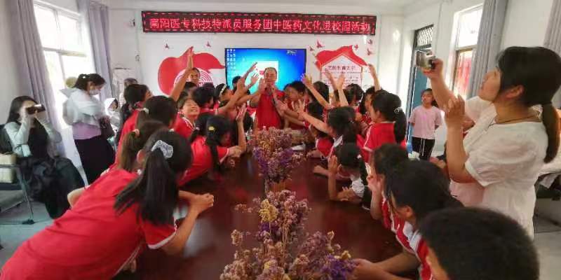 活动中,科技特派员服务团向学校捐建了中医药文化展室,含有一百余种中药材标本、展板、展架等传统医药疗法器具。南阳医专二附院义诊团的医生们为同学们讲解急救和推拿保健知识,邀请他们亲身体验中药制作过程,并为家长及周边群众提供慢性病义诊活动。