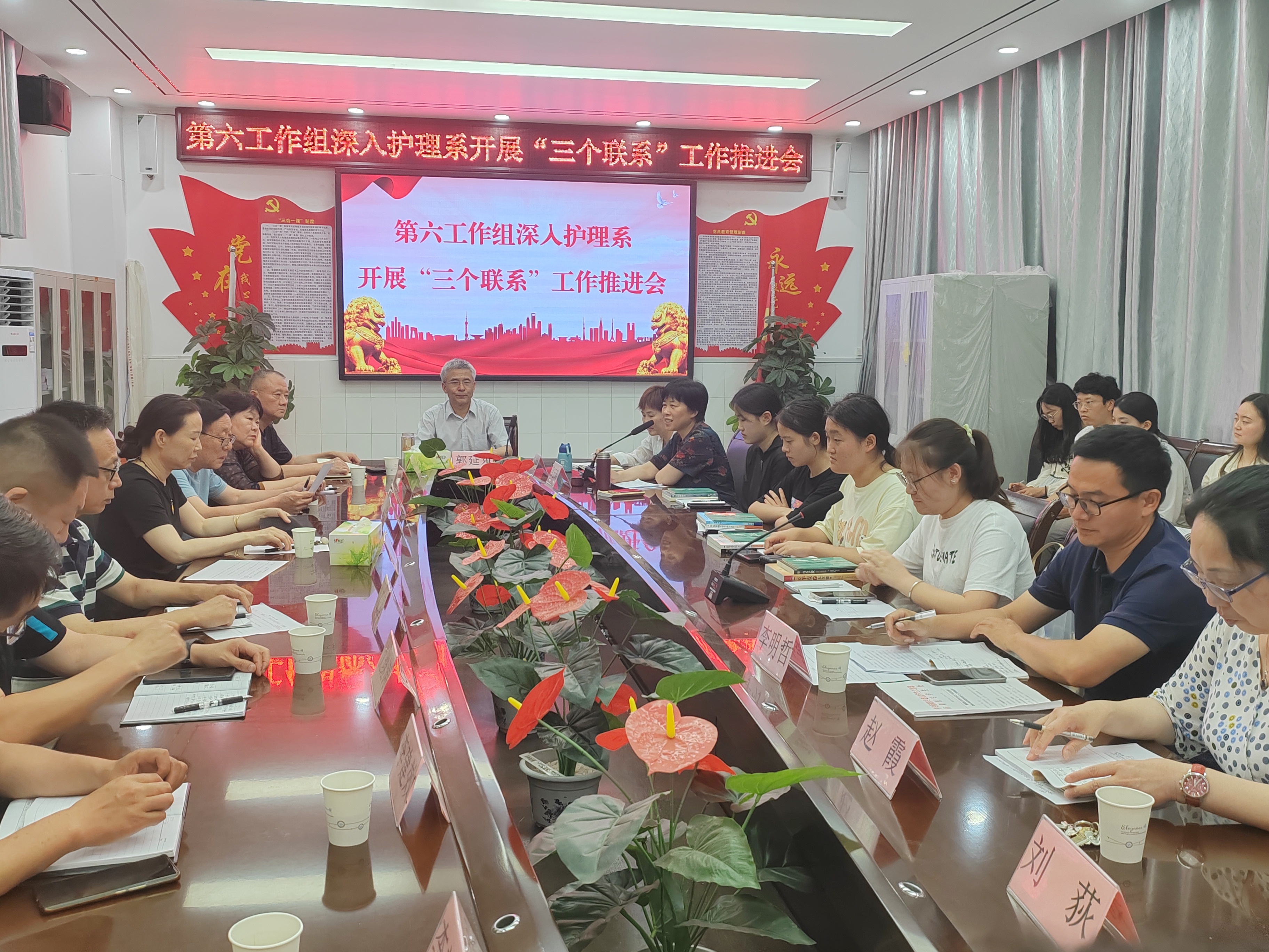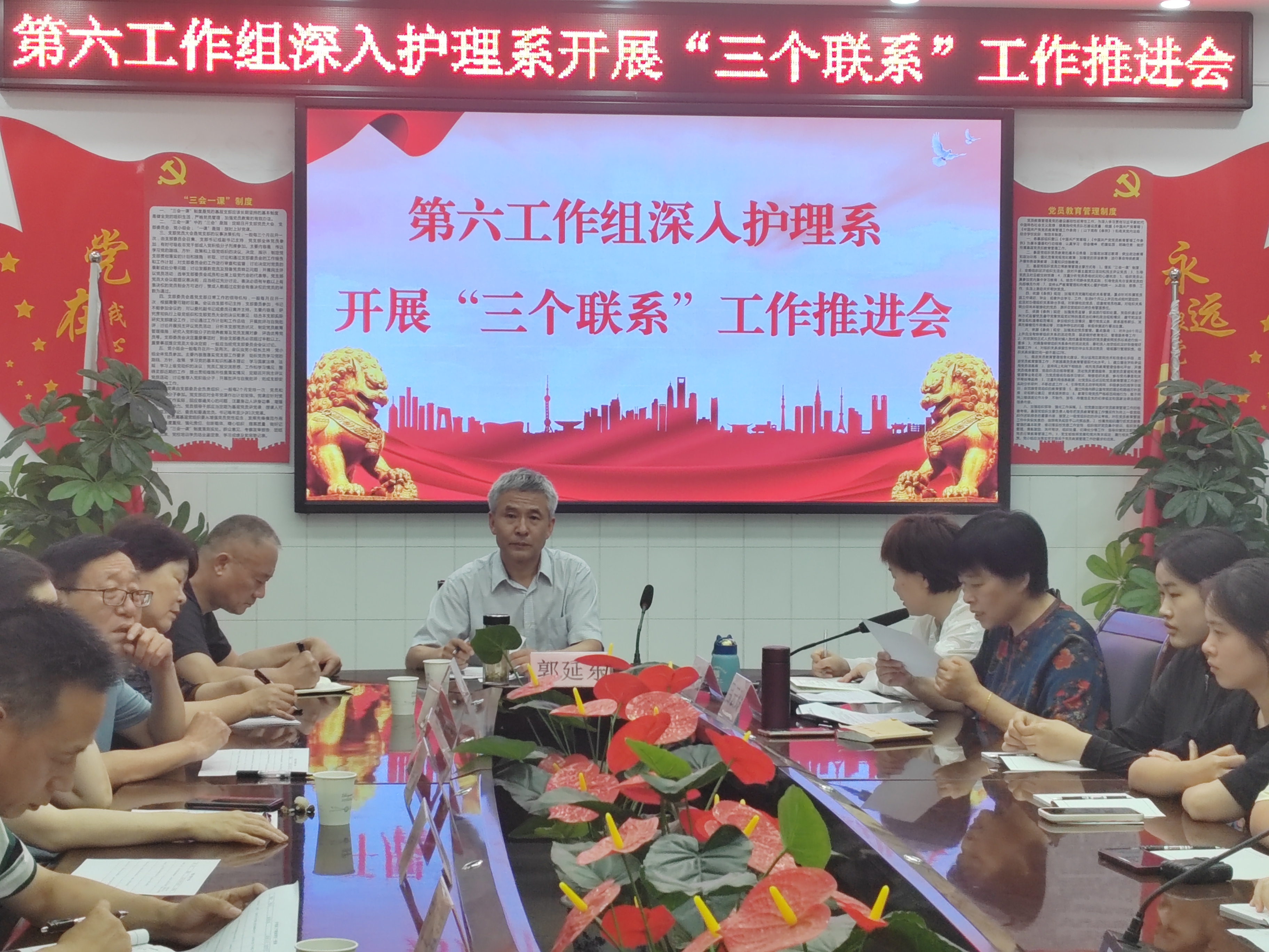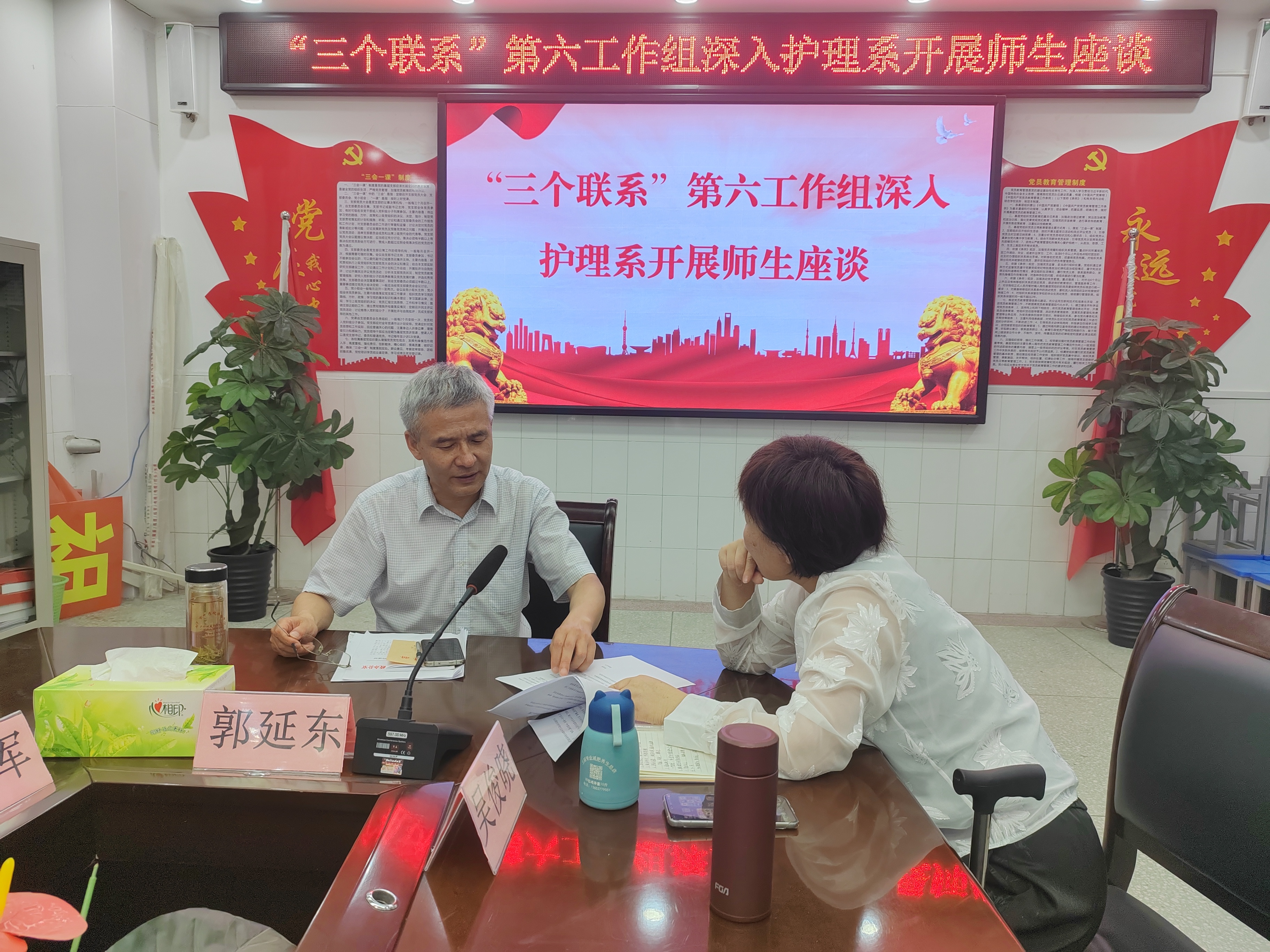 本网讯(文/护理系 何红丽)6月19日,校党委委员、副校长郭延东带领第六工作组深入护理系开展“三个联系”推进工作。总务处、人事处、图书馆等部门相关联系干部,护理系全体副科以上干部、辅导员和学生代表参加会议。会议由护理系主任吕云玲主持。