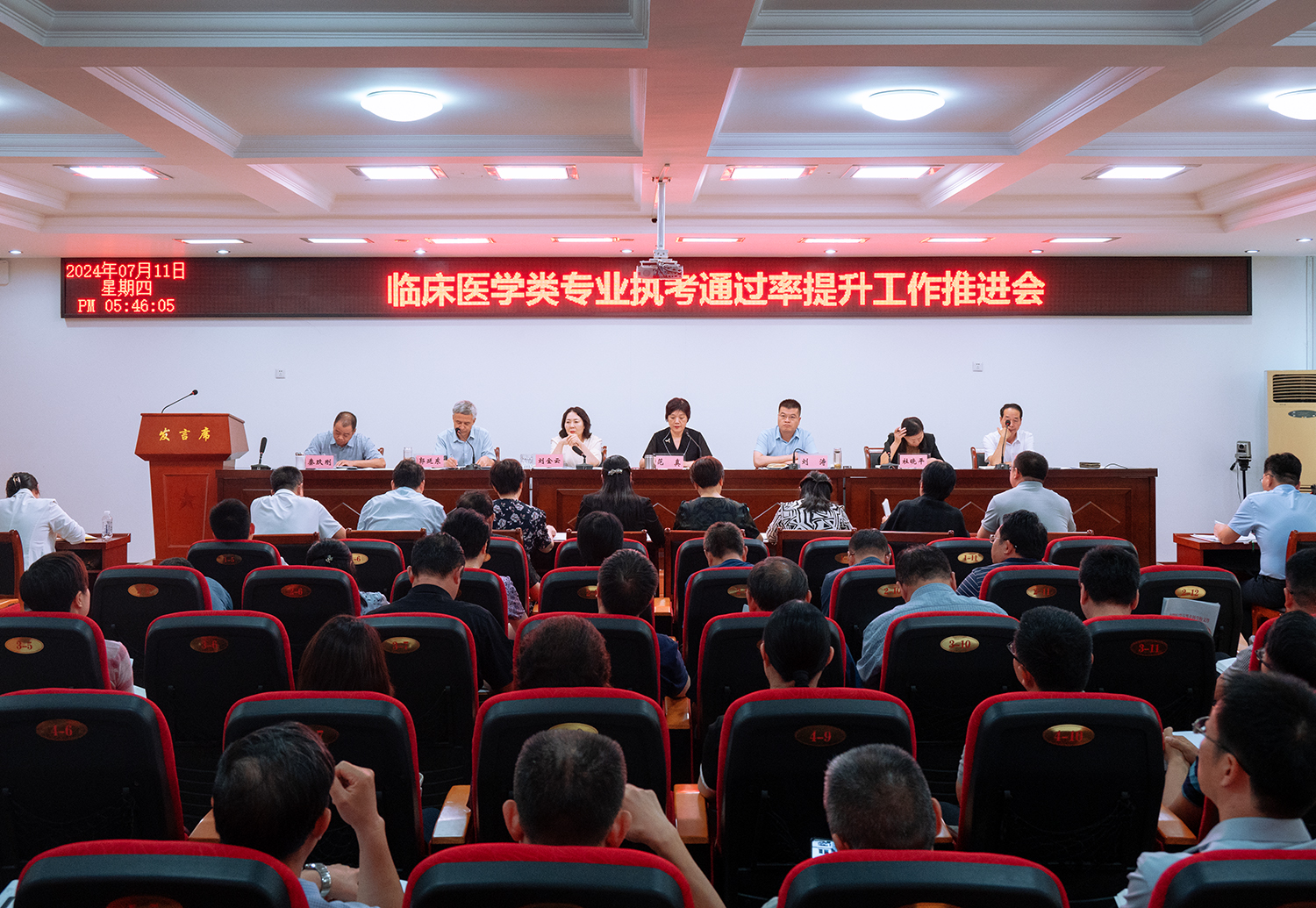 本网讯(文/质量管理办公室 马凤巧)7月11日下午,我校在1号办公楼5楼会议室召开临床医学类专业执考通过率提升工作推进会。校长范真,党委副书记刘涛,纪委书记刘金云,工会主席杜晓平,副校长郭延东、刘荣志、秦玖刚以及各部门负责人参加会议。会议由副校长郭延东主持。