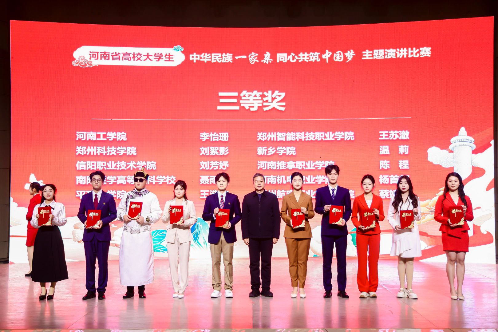 自2018 年起,河南省已连续成功举办 6 届高校大学生中华民族一家亲主题演讲比赛。本届比赛省内151所高校选手进入复赛,45名高校选手入围决赛。我校国际教育学院聂雨彤同学凭借扎实的演讲功底和真挚的情感表达,最终获得三等奖的好成绩,展现出我校大学生良好的专业素养和精神风貌。