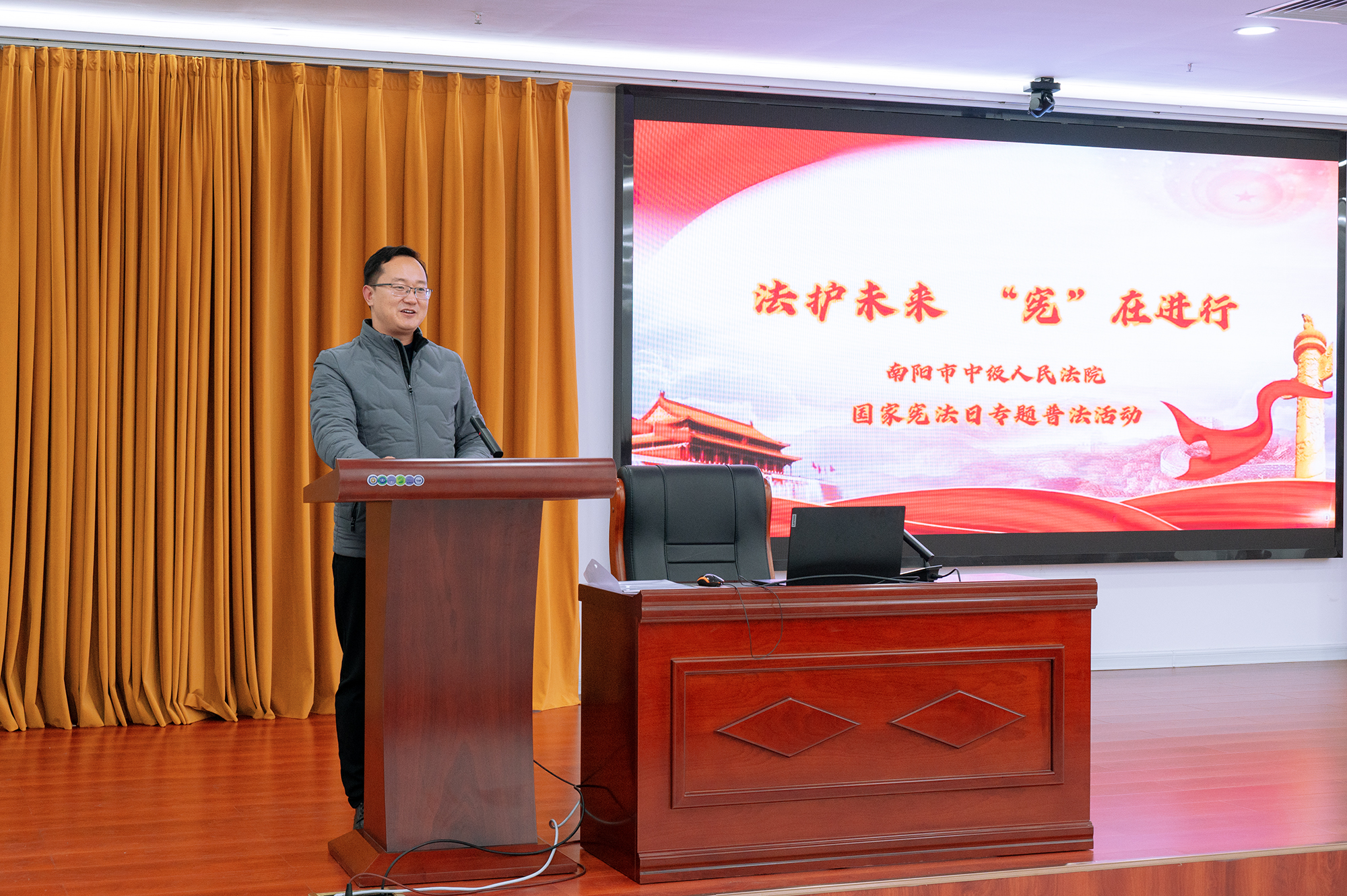 本网讯(文/法制办 张斌)为强化师生法治观念,积极推进平安校园建设,在第十一个国家宪法日来临之际,12月3日,我校邀请南阳市中级人民法院审判委员会委员、三级法官郑荣敏带领少年综合审判庭全体成员来校,开展了宪法及大学生常见涉法问题法治教育讲座。校党委委员、副校长秦玖刚致欢迎辞,法制办全体同志及各涉学系(部、院)学工办主任、辅导员代表、学生代表等300余人参加讲座。