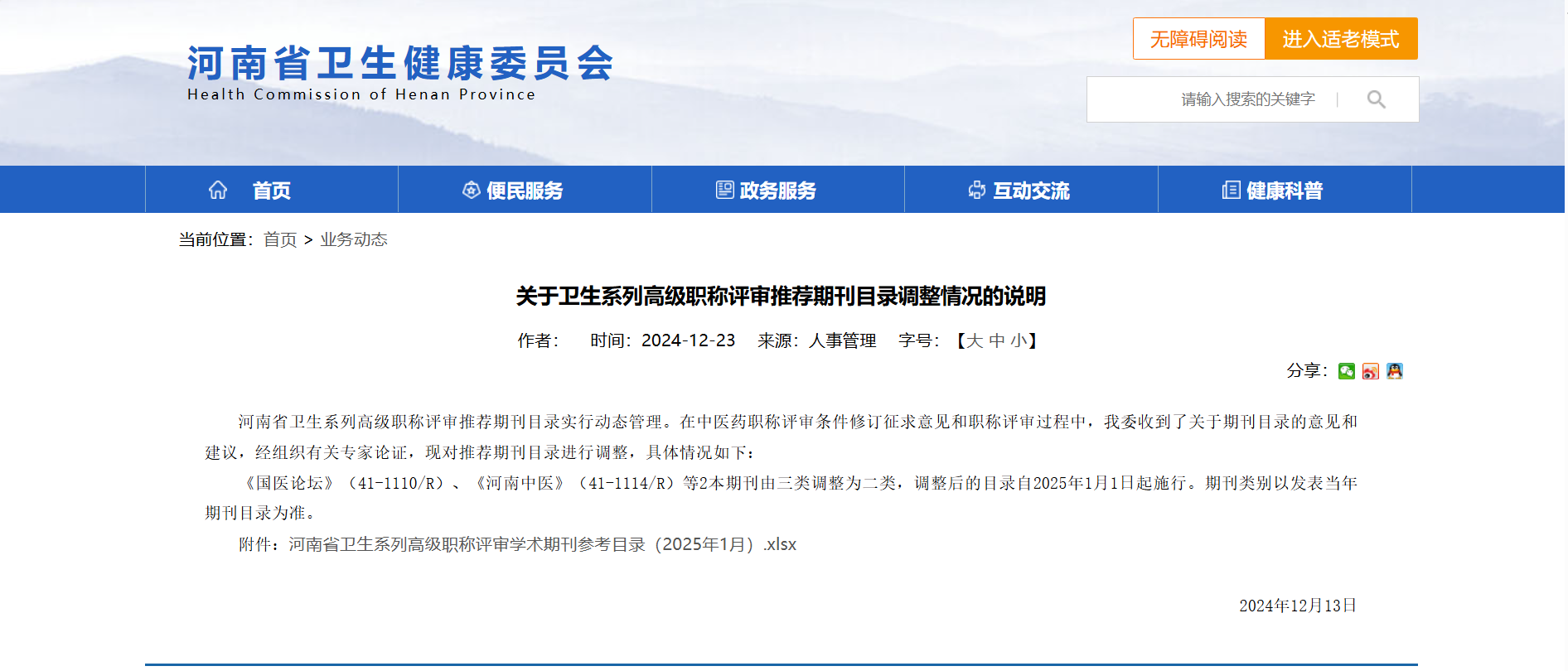 本网讯(文/国医论坛编辑部 魏怡晨)根据河南省卫生健康委员会发布的《关于卫生系列高级职称评审推荐期刊目录调整情况的说明》,《国医论坛》杂志自2025年1月1日起晋升为河南省卫生系列高级职称评审二类学术期刊。此次调整也标志着《国医论坛》杂志的学术质量和影响力有了质的提升。《国医论坛》杂志创刊于1986年,现由中华中医药学会、威客电竞·(中国)VK GAMING,主办,河南省中医药管理局主管。2011年被评为河南省自然科学一级期刊。杂志被中国知网、万方数据、重庆维普、长江文库等多家国内知名数据库和文摘杂志收录,成为这些数据库和文摘的统计源期刊。《国医论坛》杂志入选AMI职院刊扩展版(2022版)。