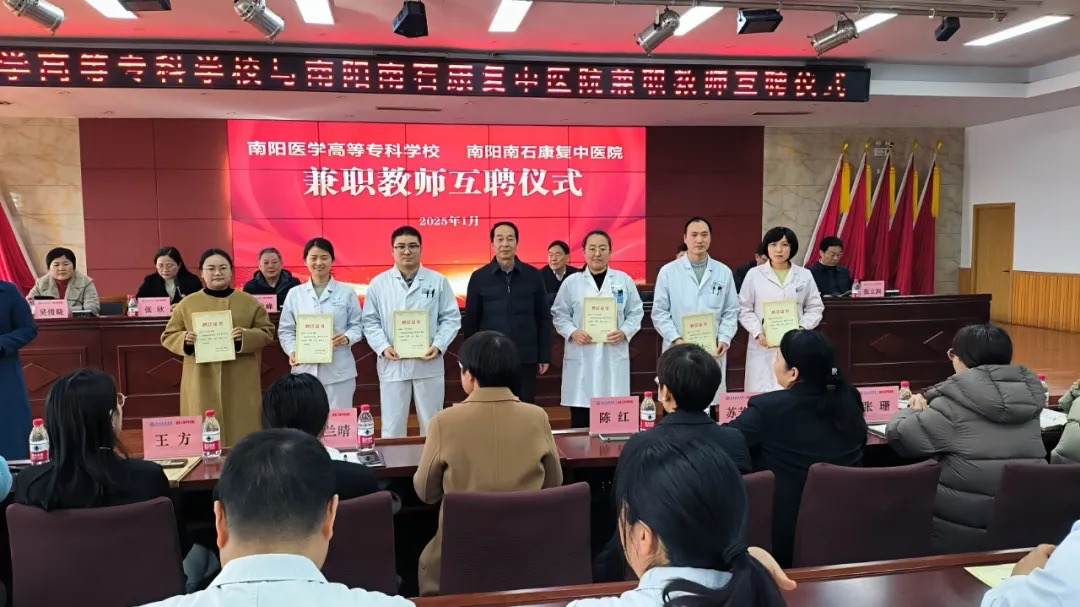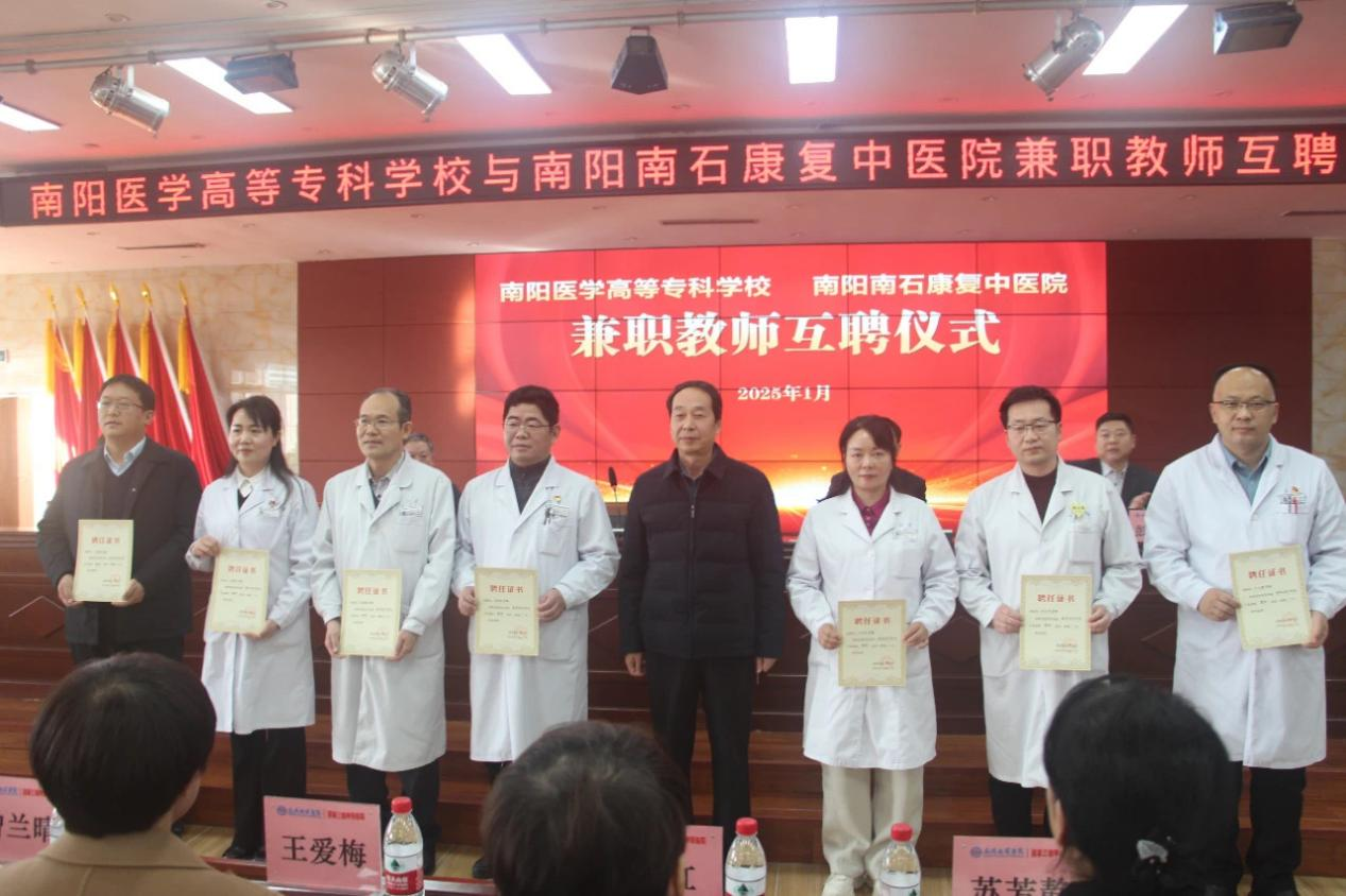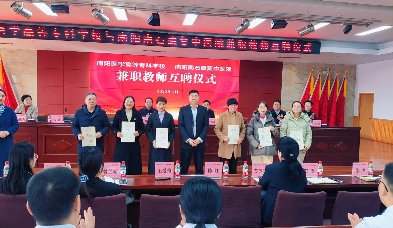 本网讯(文/康复医学系 陈红)1月6日,南阳医专与南石康复中医院教师互聘及学生优秀岗位标兵表彰会在南石医院举行。南阳医专党委委员、副校长刘荣志,南石医院副院长石军峰、彭兆龙、康复医学系领导,南石康复中医院院长王建晖以及学校和医院教师代表出席活动,南阳医专22级康复治疗技术班学生参加了会议。